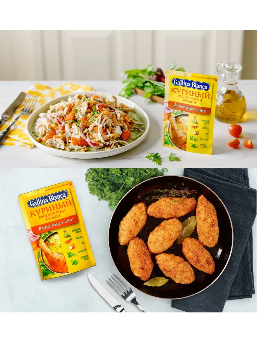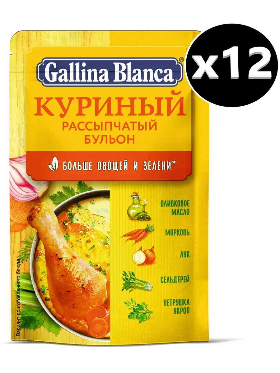 Gallina Blanca представляет новое поколение рассыпчатых бульонов с формулой, обогащенной оливковым маслом, с еще большим количеством овощей и зелени. Инновационная практичная упаковка с устойчивым дном и многоразовой застежкой делает хранение и использование продукта еще более удобным. Как приготовить Зразы с начинкой из куриного мяса: Шаг 1. Куриное филе мелко нарежьте, сыр натрите на тёрке. В сковороде разогрейте сливочное масло и обжарьте курицу в течение трёх минут, после чего добавьте сыр. Перемешайте, снимите с огня и дайте остыть. Шаг 2. Фарш приправьте, добавьте в него «Куриный рассыпчатый бульон» Gallina Blanca и слепите из фарша лепёшки. Хлеб аккуратно раскрошите руками. Полученной крошкой посыпьте рабочую поверхность, затем выложите на неё слепленные из фарша лепёшки. Положите в середину каждой по 1 ст. л. начинки из куриного мяса, соедините края лепёшки, чтобы сформовать котлеты. Шаг 3. Обжарьте котлеты в разогретом масле по 4 минуты с каждой стороны. Затем, уменьшив огонь, готовьте под крышкой в течение 10 минут. В комплекте 12 пакетиков по 90г.