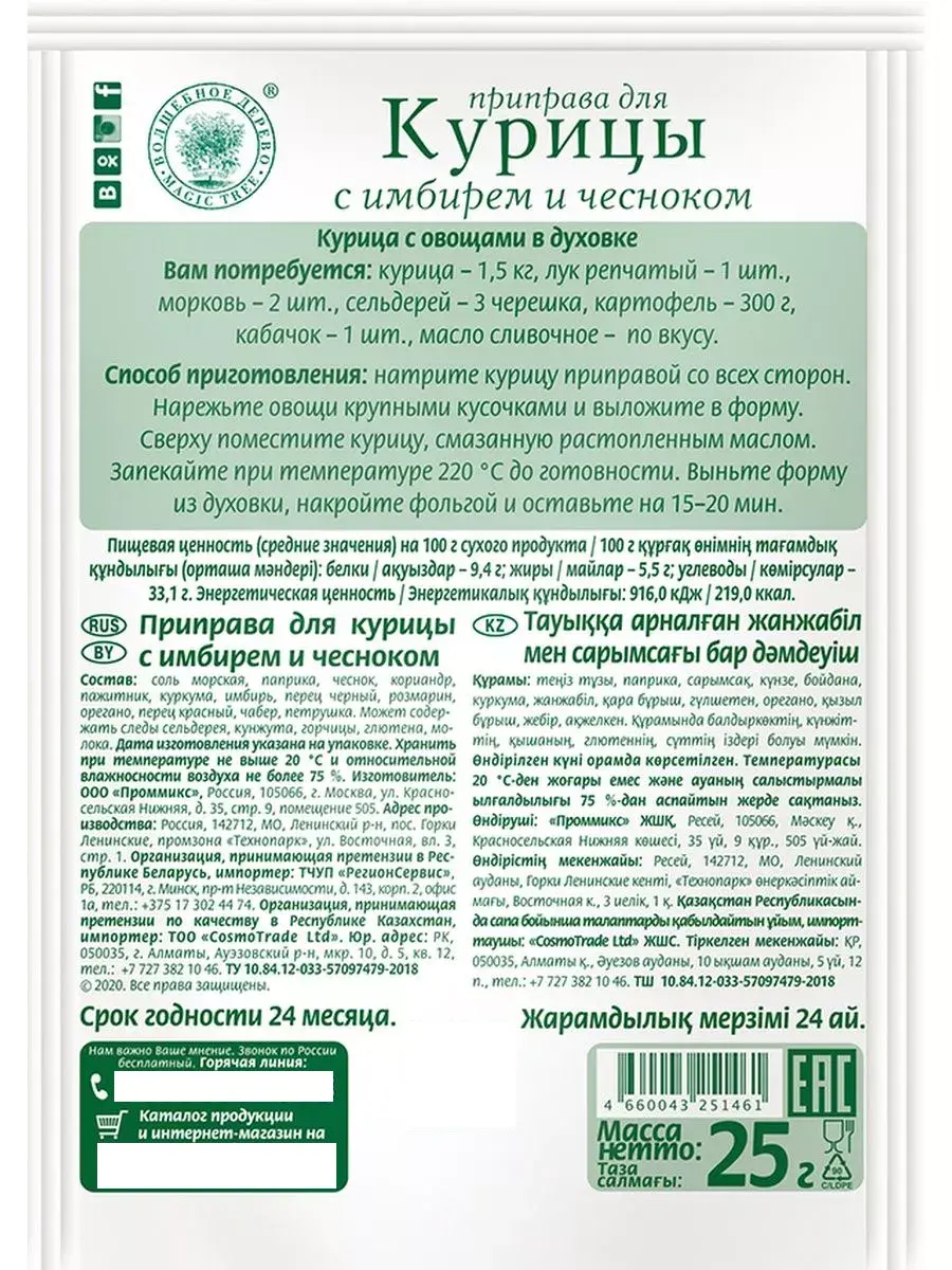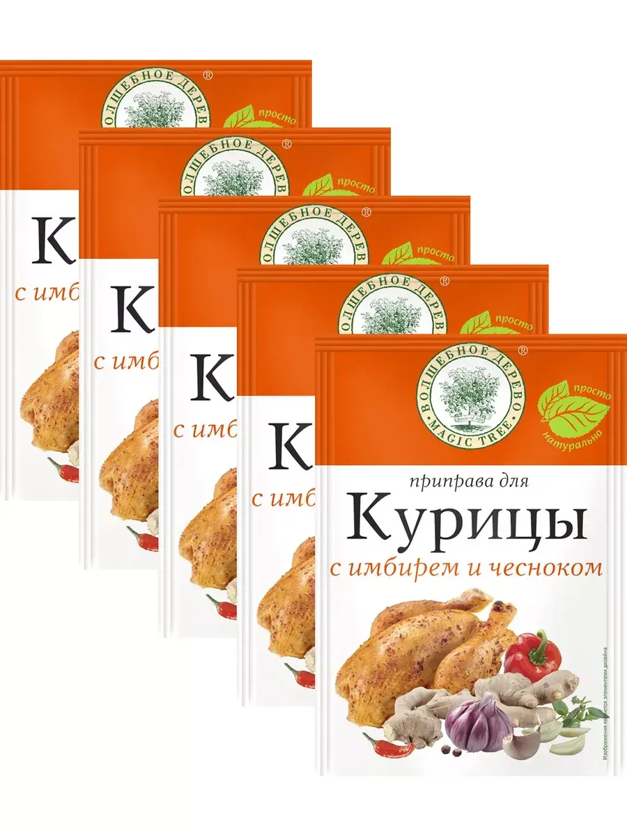 Приправа с имбирём и чесноком имеет насыщенный вкус и придаёт готовому блюду пряный аромат. Компоненты гармонируют между собой и сочетаются с базовыми ингредиентами, используемыми для маринадов, заправок: растительным маслом, мёдом, лимонным соком. Кроме имбиря и чеснока, приправа включает паприку, розмарин и орегано - базовые специи для всех видов мяса. Также в составе присутствует пажитник, который отличается характерным орехово-сладким вкусом. Рекомендуем натирать курицу смесью специй перед запеканием. Также приправа подойдёт для тушения, жарки и приготовления курицы на гриле. В комплекте 5 штук по 25г.