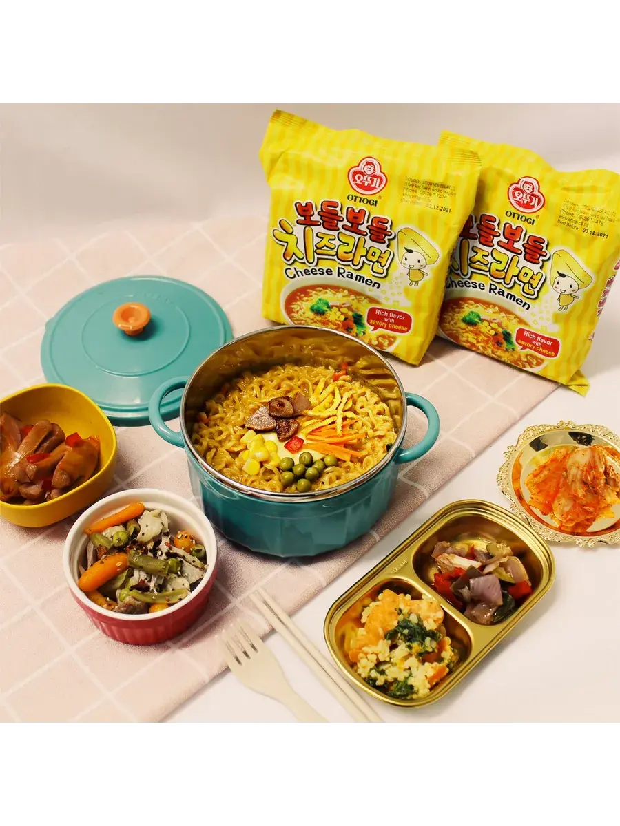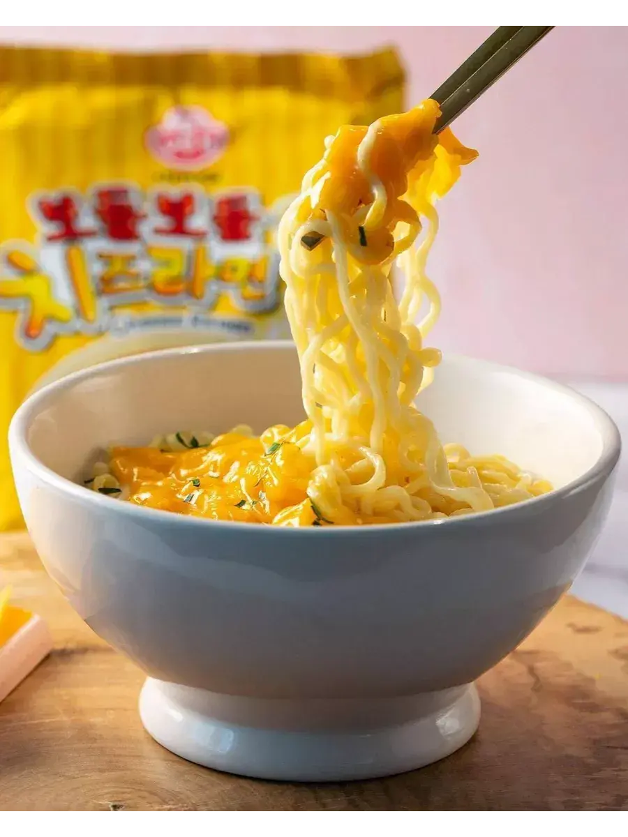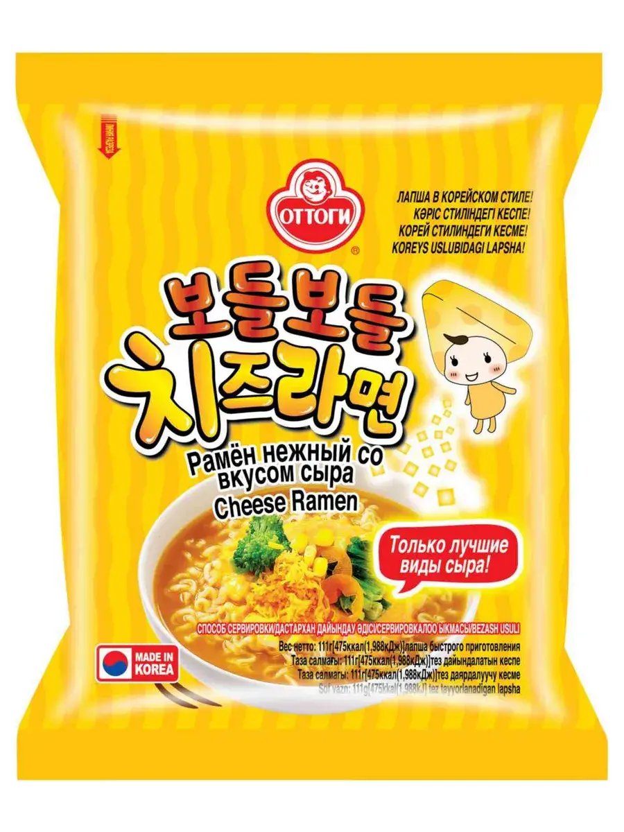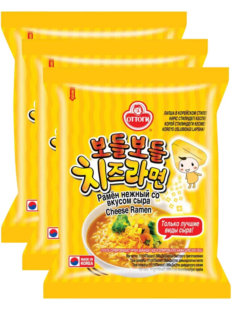 Лапша быстрого приготовления Cheese Ramen от Ottogi - еще один вариант непревзойденного тандема острой и сырной приправ, прекрасно сочетающихся с нежным раменом. Суп достаточно сытный, он быстро утолит чувство голода, а также согреет и наполнит энергией. Упаковку сырного рамена удобно брать с собой в поездки, путешествия, походы, ведь на его приготовление требуется лишь несколько минут. Способ приготовления: добавьте в кастрюльку или сотейник 550 мл. воды (2 и 1/4 стакана), добавьте овощную смесь и доведите до кипения. После этого добавьте лапшу и суповую основу (приправу). Готовьте в течение 4 минут. По вашему вкусу дополнительно можно добавить яйцо, зелень, сыр и т.д. Снимите с огня, добавьте сырную пудру, хорошо перемешайте и наслаждайтесь вкусом настоящего корейского сырного рамена. В комплекте 3 пачки по 111г.