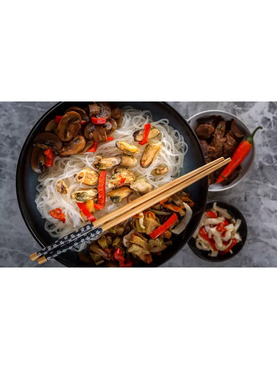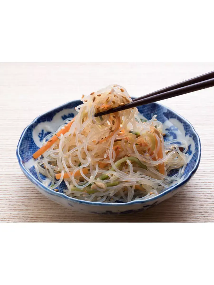 Крахмальная лапша фунчоза изготовлена из картофельного и пшеничного крахмала, который не содержит глютен. Эта тонкая прозрачная лапша одна из самых знаменитых видов азиатской лапши. Она известна также под названием «стеклянная лапша». Две основные причины ее популярности — универсальность использования и скорость приготовления. Готовая лапша может подаваться в горячем и в холодном виде, она прекрасно сочетается с любыми сортами мяса, рыбой и морепродуктами, овощами, входит в состав салатов, закусок, супов и вторых блюд, сочетается с огромным количеством приправ и соусов. Лапша отлично впитывает различные соусы и заправки. Ее универсальность дополняется быстрым приготовлением: достаточно двух минут варки или просто залить кипятком на пять минут. Кроме того, фунчоза достаточно малокалорийна, не содержит глютена, а также богата витамином E и рядом микроэлементов