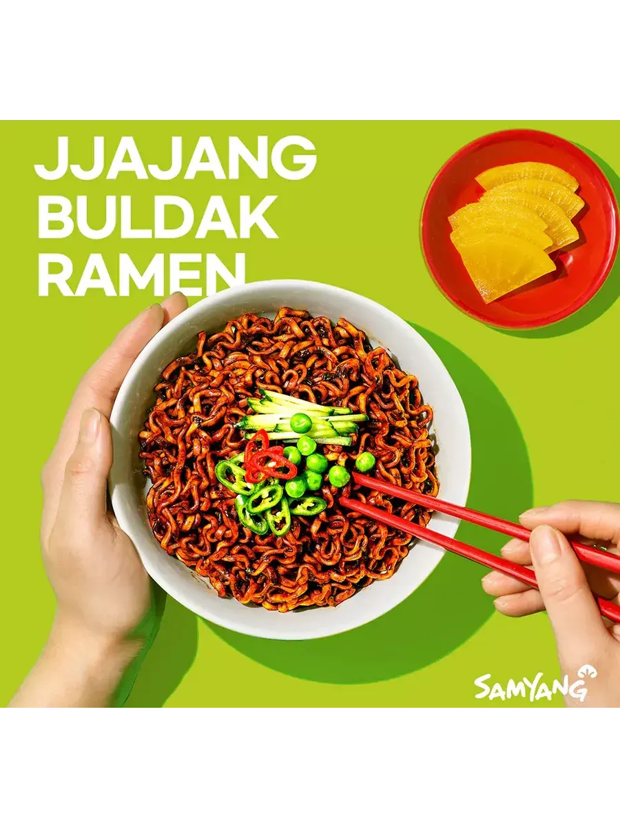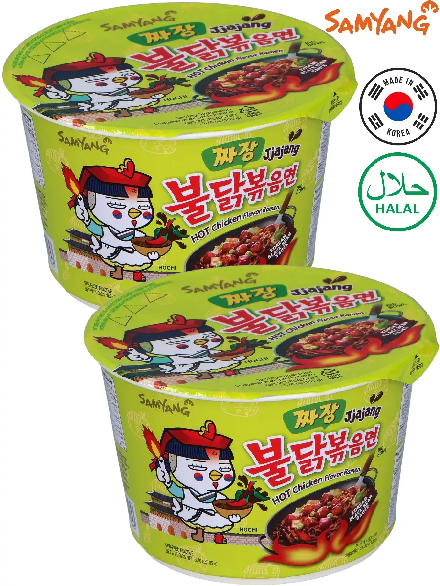 Еще один вариант огненно-острого корейского рамена от Samyang - Hot Chicken Flavor Ramen Buldak Jjajang. Как уже понятно из названия, это лапша с соусом Бульдак и Чачжан. Чачжан - традиционный корейский соус из черных бобов, именно с ним готовится Чачжанмен - лапша с вышеупомянутым сладковатым бобовым соусом. Вместе со жгучим соусом Бульдак получается необыкновенный тандем оригинального восточного вкуса и остроты. Упаковка рамена включает в себя брикет лапши, а также два пакетика: с сушеными овощами и с острым соусом. В комплекте 2 упаковки по 105г.