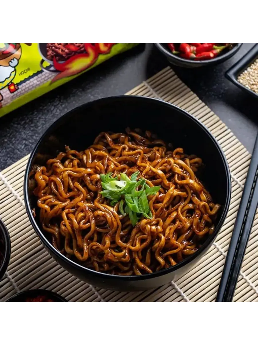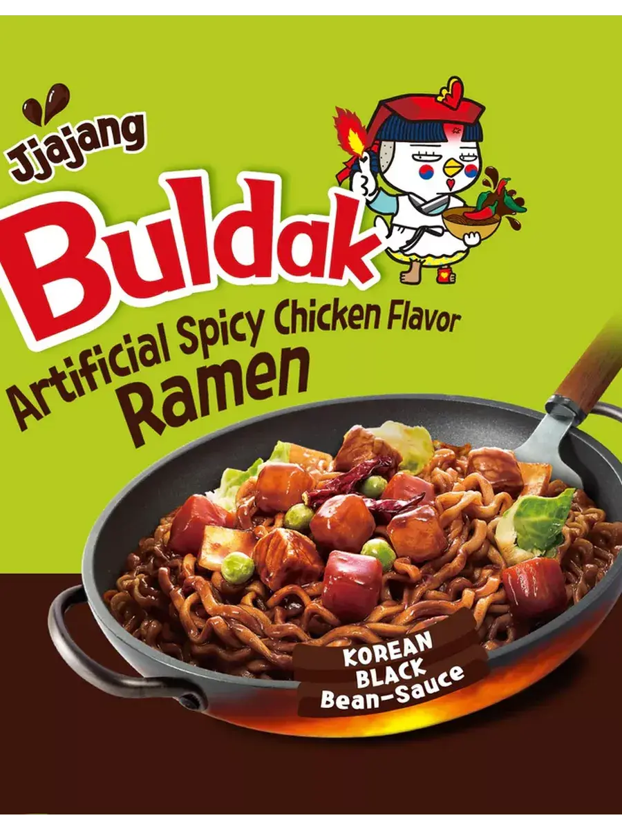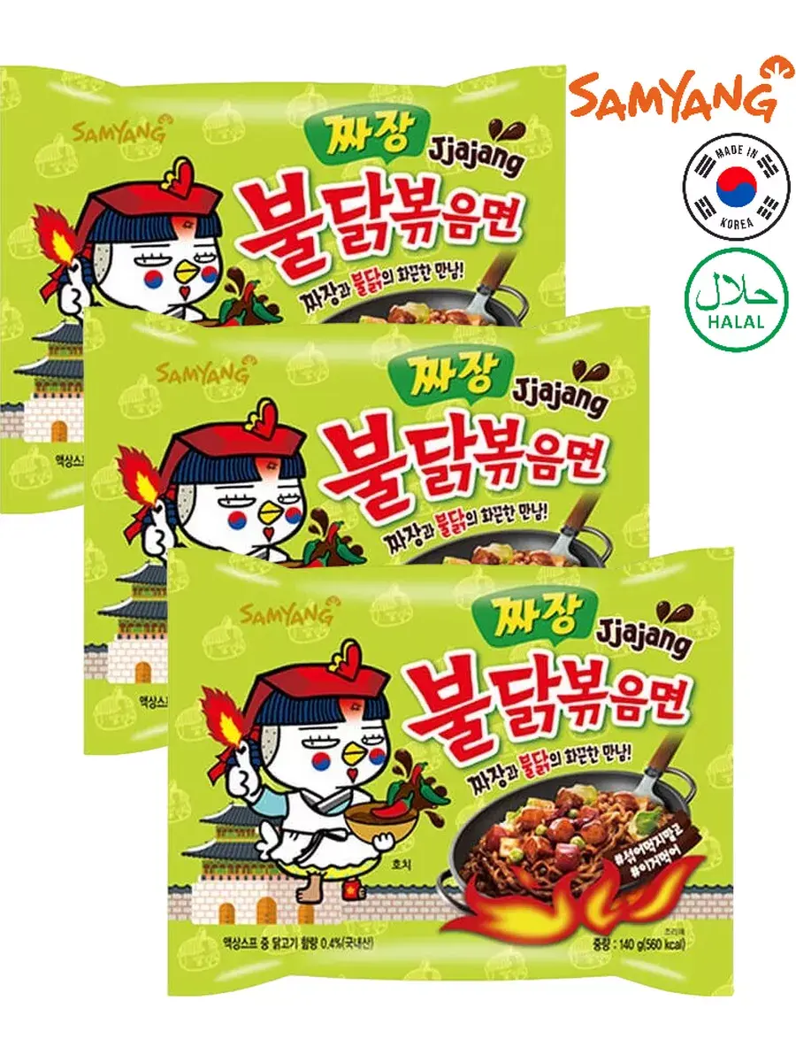 Еще один вариант огненно-острого корейского рамена от Samyang - Hot Chicken Flavor Ramen Buldak Jjajang. Как уже понятно из названия, это лапша с соусом Бульдак и Чачжан. Чачжан - традиционный корейский соус из черных бобов, именно с ним готовится Чачжанмен - лапша с вышеупомянутым сладковатым бобовым соусом. Вместе со жгучим соусом Бульдак получается необыкновенный тандем оригинального восточного вкуса и остроты. Упаковка рамена включает в себя брикет лапши, а также два пакетика: с сушеными овощами и с острым соусом. В комплекте 3 упаковки по 140г.
