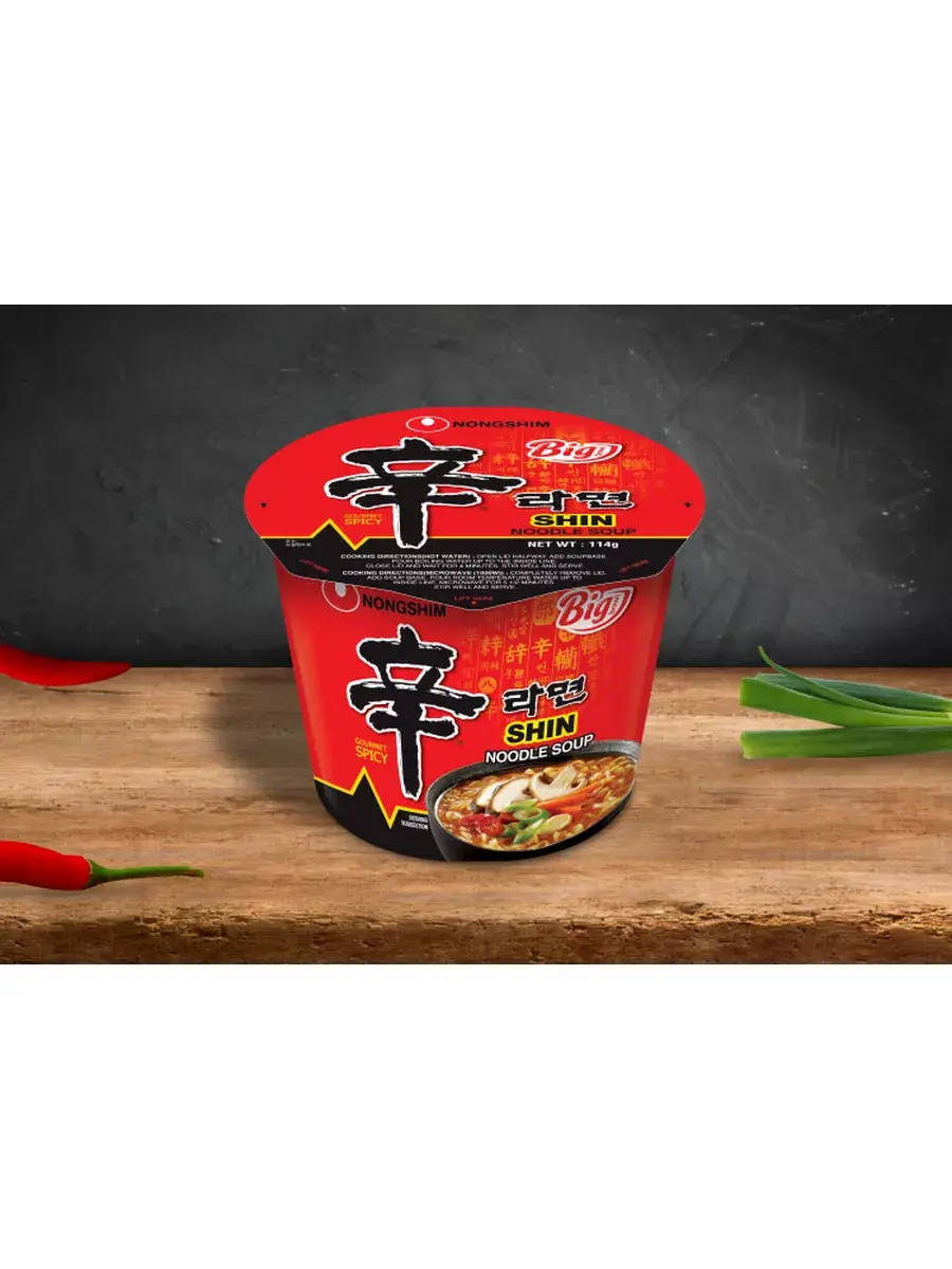 Шин Рамен — острая ароматная паста. В ее состав входят овощные и грибные хлопья, а насыщенный и терпкий бульон умами содержит соевый соус, экстракты анчоуса и ламинарии. За остроту блюда отвечает тщательно подобранный букет специй