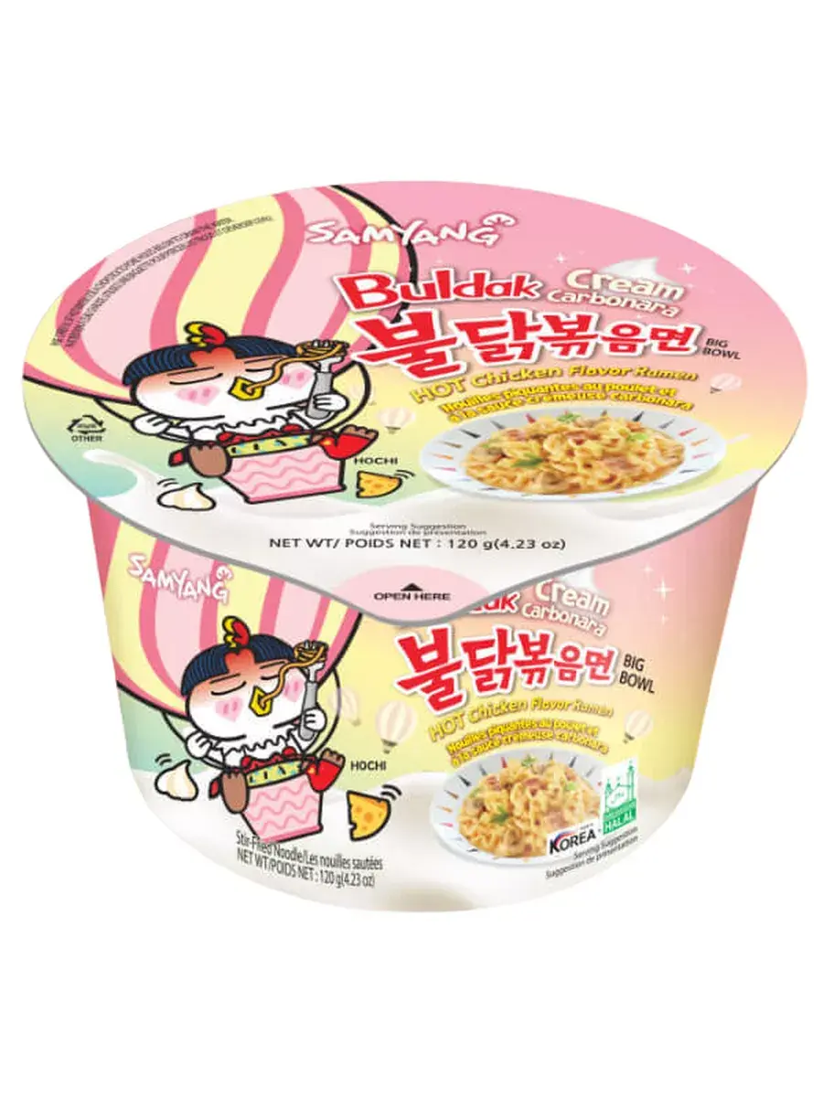 Samyang Hot Chicken Flavor Ramen Cream Carbonara — это вариант корейской лапши Samyang с кремовым соусом Карбонара и острым вкусом курицы. Сочетание острого вкуса курицы и кремового соуса Карбонара придает лапше неповторимый вкус. Кремовый соус создается на основе сыра, сливок и яичных желтков, а острота достигается за счет добавления соуса на основе чили и приправ.