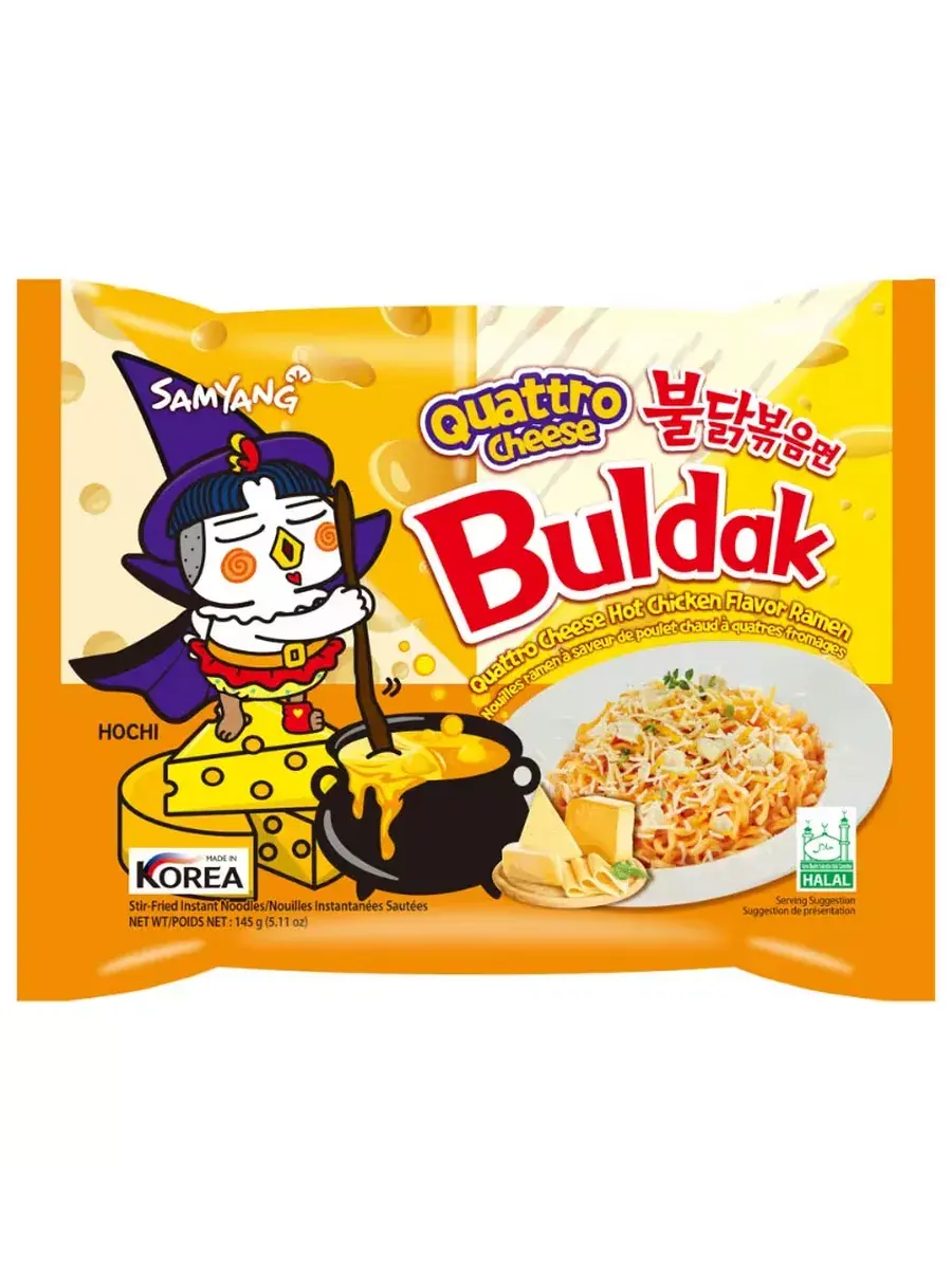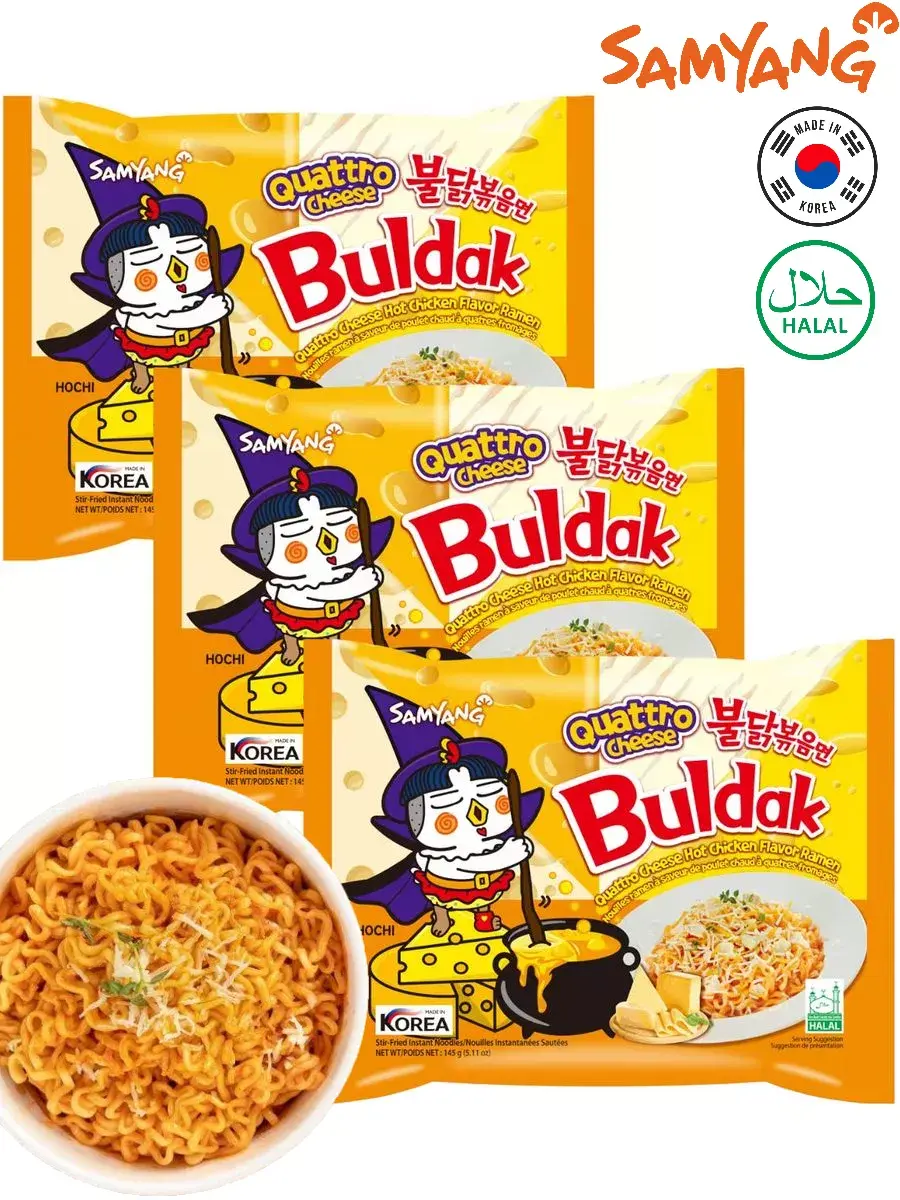 SamYang Buldak Quattro Cheese - гновинка от популярного в Корее производителя острой лапши Samyang. Теперь еще вкуснее! Острый пикантный вкус и насыщенный аромат 4 видов сыра. Уникальное сочетание сыров с пикантной острой курицей. Для создания невероятного соуса использовали моцареллу, гауду, чеддер и камамбер. Рекомендуется всем любителям сыра! Пшеничная лапша – одно из главных составляющих корейской кухни, и ее можно встретить в самых разных формах. Лапша для варки в удобной пачке с дополнительным соусом позволяет всего за 5 минут приготовить полноценный обед, который обязательно захочется повторить. В комплекте 3 упаковки по 145г.