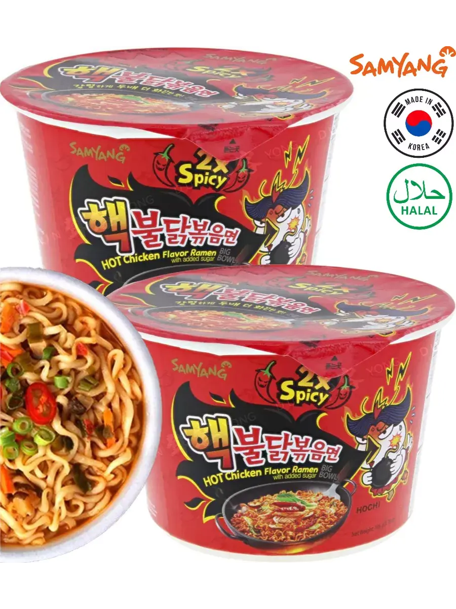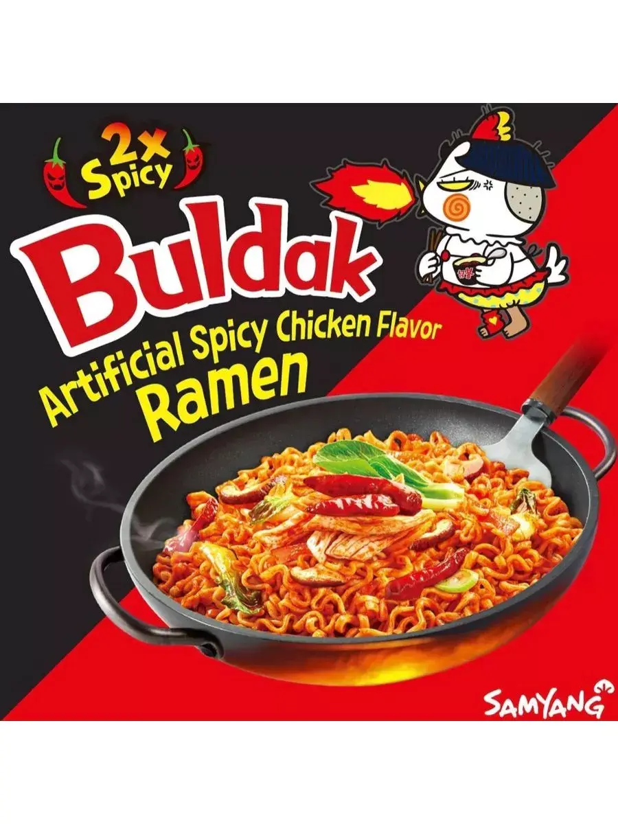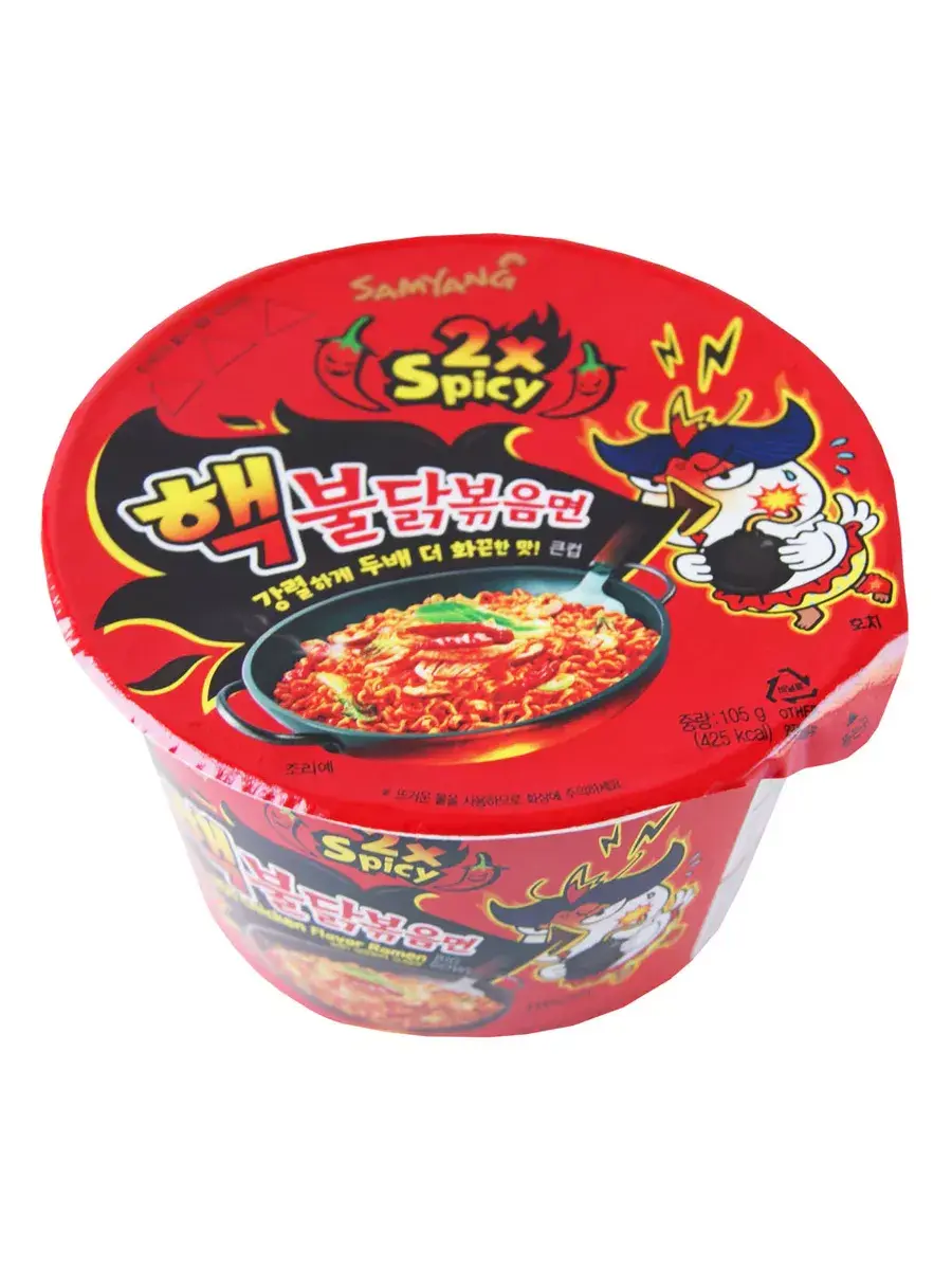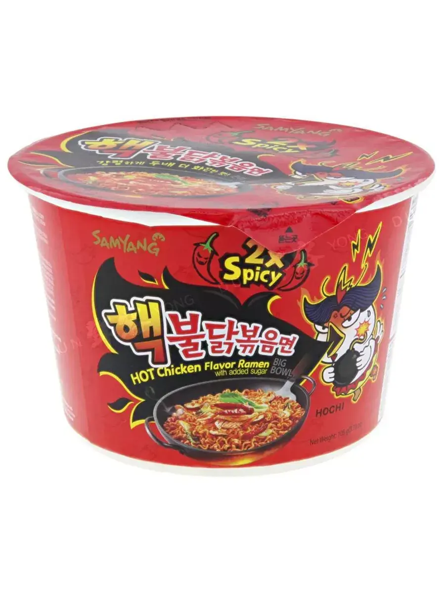 Лапша SamYang 2x Spicy со вкусом очень острой курицы пользуется огромной популярностью у всех любителей блюд Южной Кореи. Она в 2 раза острее классического вкуса. Настоящий корейский вкус для ценителей острого и обжигающего рамена. Даже самые опытные и отважные любители жгучих блюд высоко оценивают данную лапшу, а также выкладывают в интернет ролики с записью ее дегустации. За остроту ощущений здесь отвечают лук, чеснок, карри и смесь перцев, а завершающую освежающе-ореховую ноту обеспечивают жареная морская капуста и семена кунжута. Большая пачка сытной лапши позволит быстро утолить голод, к тому же вы всегда можете добавить к супу кусочки мяса, вареное яйцо и зеленый лук. Если вы еще не пробовали такой острый рамен, используйте половину приправы. Пшеничная лапша обладает нежной, воздушной текстурой, подходит для полноценного обеда или ужина. Её удобно быстро готовить дома, ведь приготовление занимает всего 5 минут!