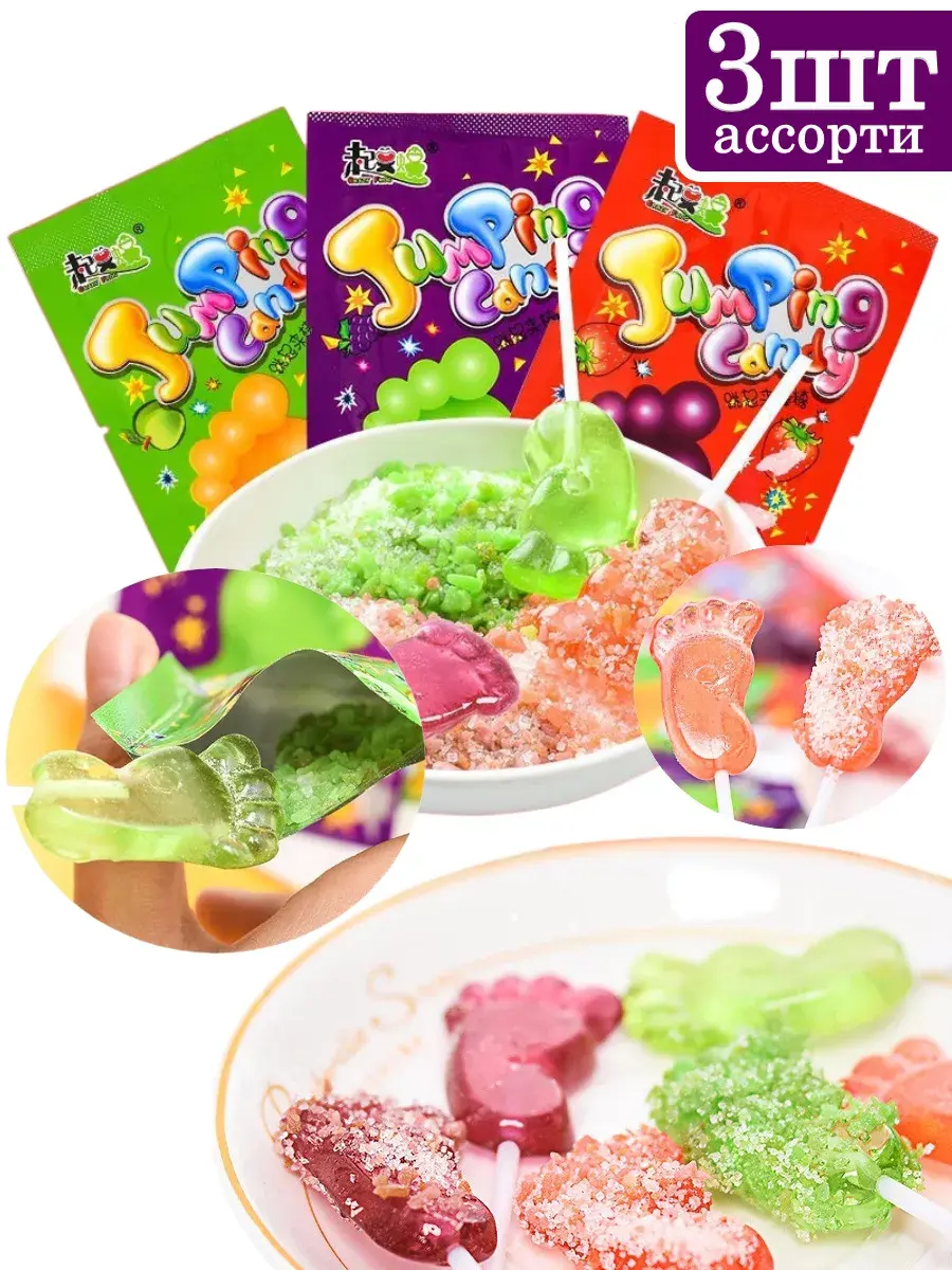 Сладкие, шипучие и безумно весёлые — это не просто конфеты, а настоящее вкусовое приключение! Леденцы в форме ярких пяточек на палочке макаются в порцию взрывной карамели, которая весело трещит и щекочет язык. Один хруст — и ты уже в центре сладкого фейерверка! Микс вкусов и красок: клубника, виноград, яблоко. Удобный формат — 3 штуки в наборе, бери с собой, угощай друзей или устраивай мини-челлендж. Яркие, сочные, фруктовые — эти пяточки созданы для тех, кто любит необычные сладости и всегда за веселье, где бы ни находился.