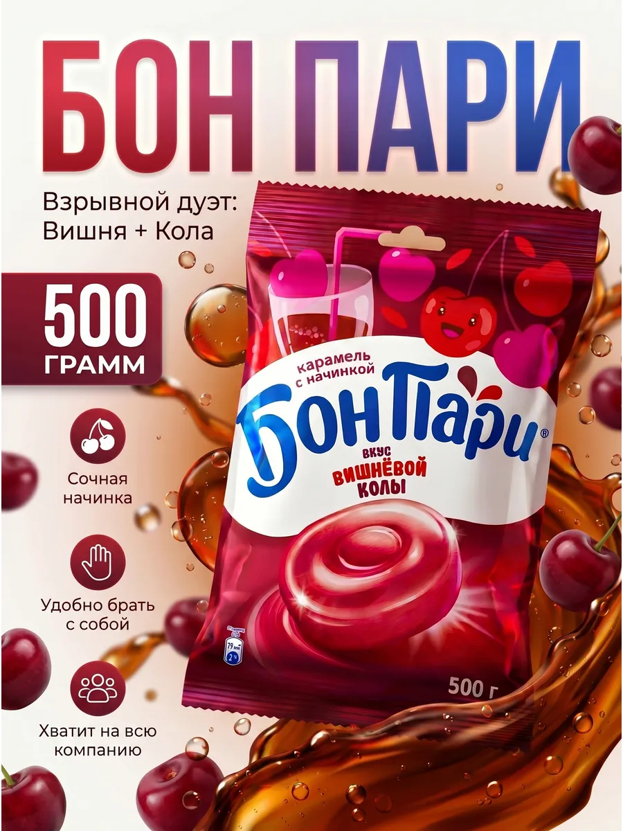 Погрузитесь в атмосферу праздника с легендарной карамелью Бон Пари «Вкус вишневой колы»!