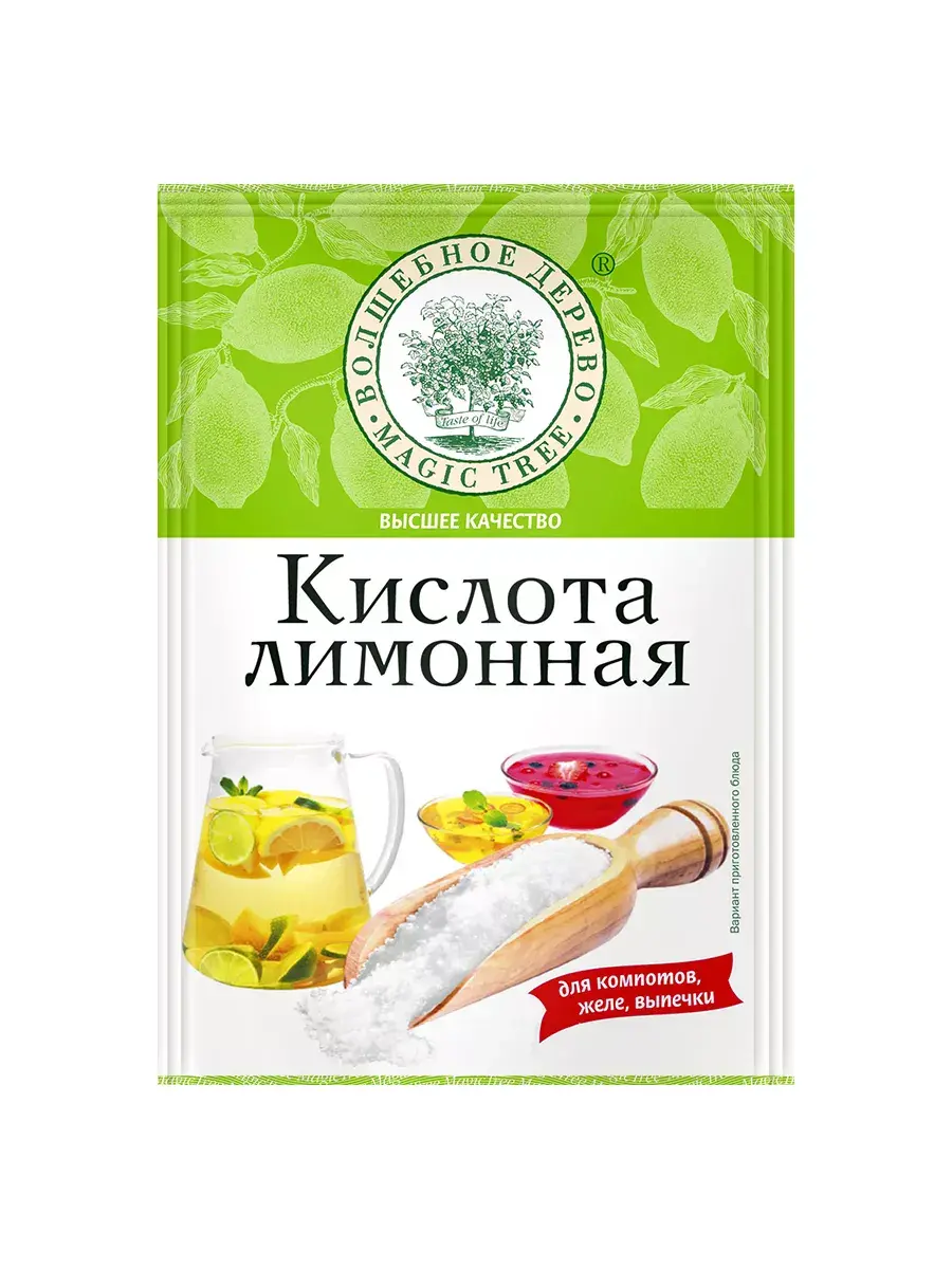 Лимонная кислота «Волшебное дерево» – универсальный продукт, который помогает дольше сохранять домашние варенья, соленья и компоты. С ней легко можно приготовить домашний майонез, а выпечке и десертам она придаст более тонкий вкус. Борщ сохранит красный цвет, если к свекле добавить немного лимонной кислоты, а яйцо пашот, сваренное в подкисленной воде, получится идеальным! Она необходима при консервации, а также используется при производстве масел для снижения горечи. Лимонную кислоту применяют в качестве освежителя в винах, ликерах и лимонадах, а также для ароматизации безалкогольных напитков. Помимо этого, она используется в качестве усилителя вкуса тортов, мороженого, пирожных, конфет и карамели. В комплекте 3 пакетика по 50 грамм.