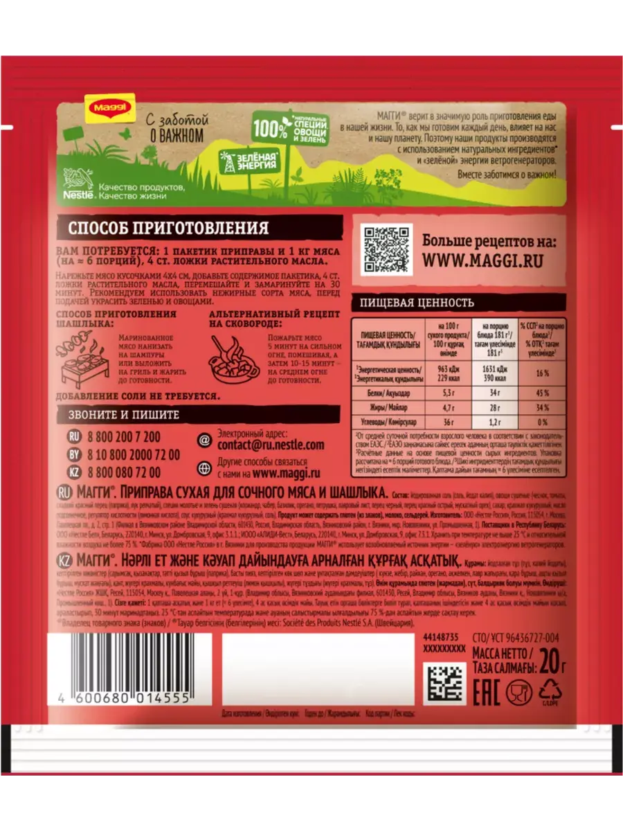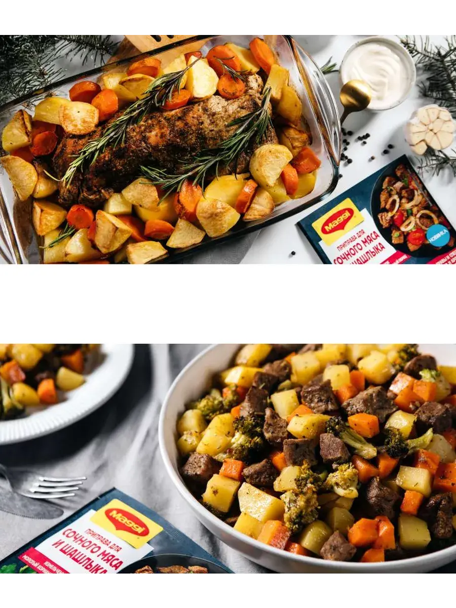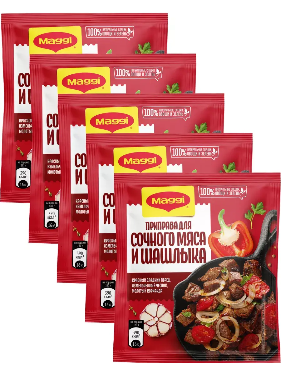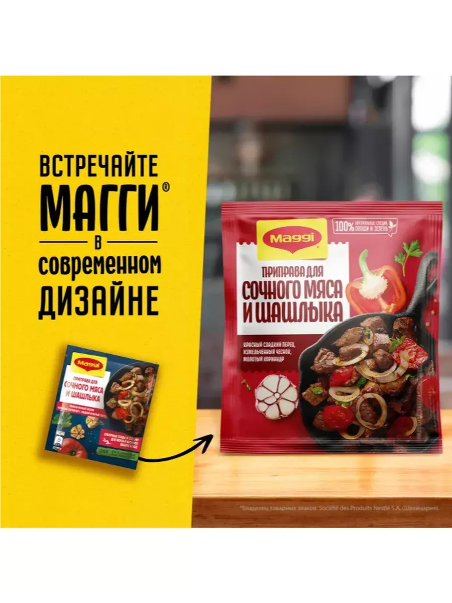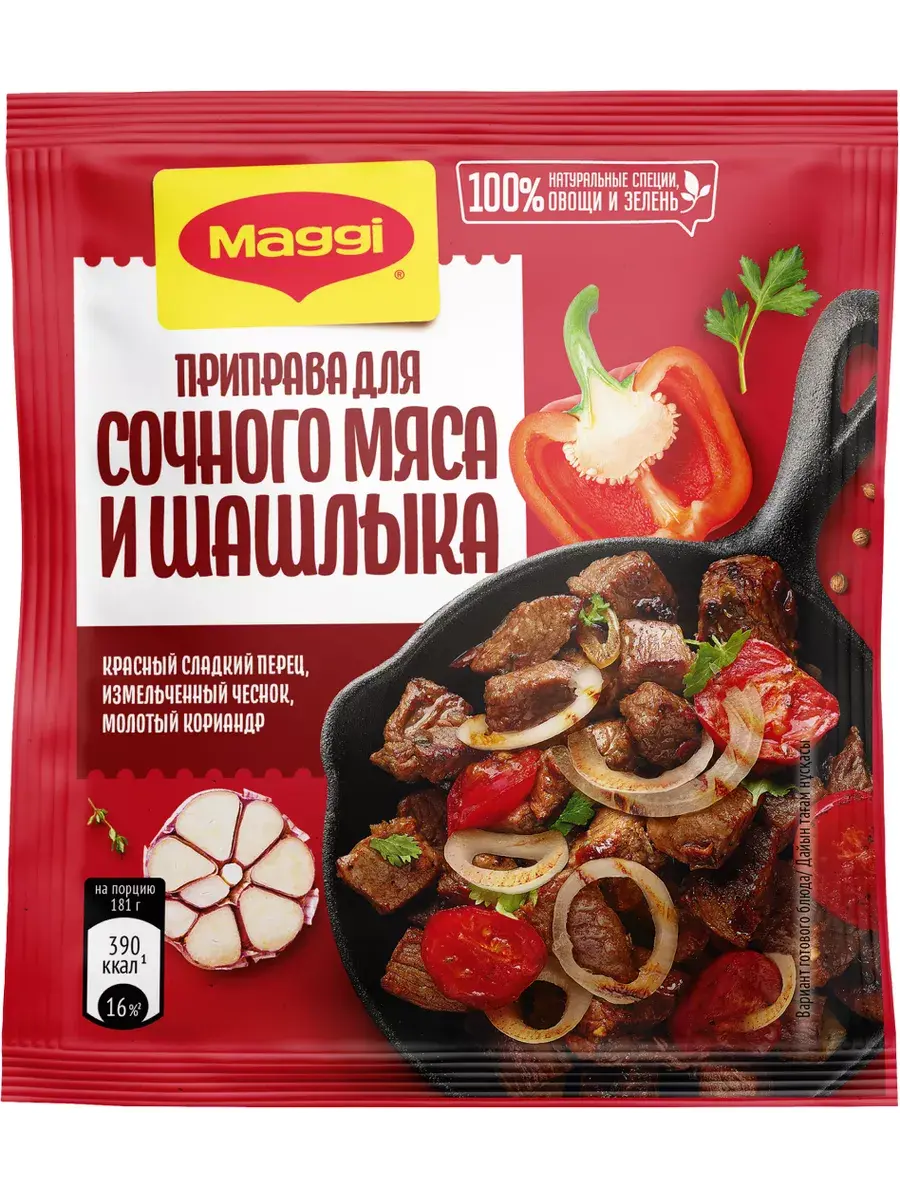 Мясо на гриле, шашлыки на мангале или сочное мясо, пожаренное на сковороде. Столько разных способов приготовления одного ингредиента, и каждый из них можно приготовить с приправой МАГГИ для сочного мяса и шашлыка. «В этой приправе я подобрал специальную композицию натуральных трав, овощей и специй, чтобы наилучшим образом подчеркнуть аромат и вкус блюд из мяса. Молотый кориандр, смесь перцев и измельченные чеснок и лук придадут мясу богатый вкус, букет из зелени петрушки, орегано, базилика и чабера наполнят блюдо особым ароматом, а сладкая паприка поможет добиться румяного цвета». Виссарион Михайлов, шеф-повар МАГГИ.