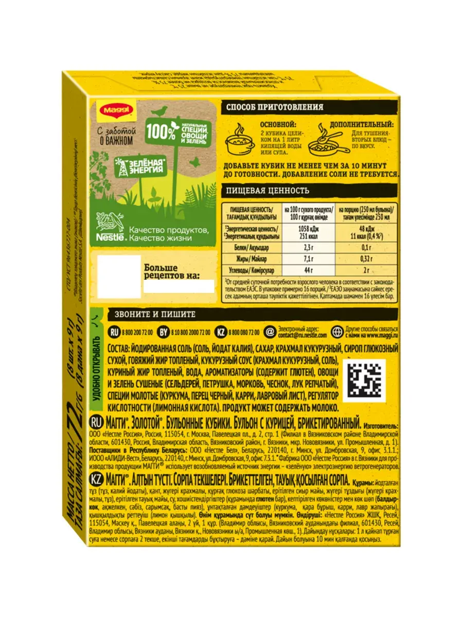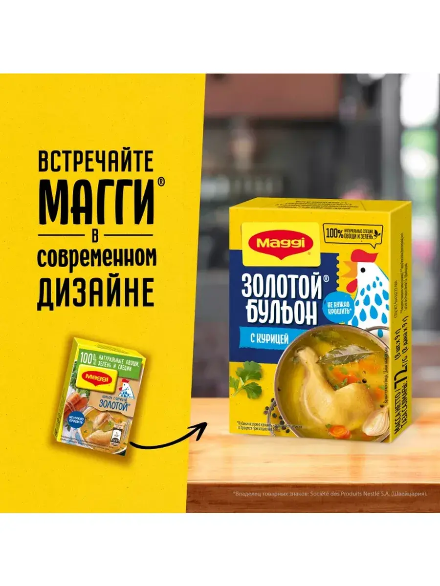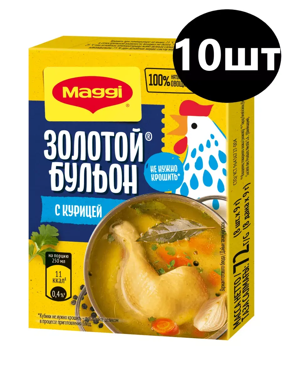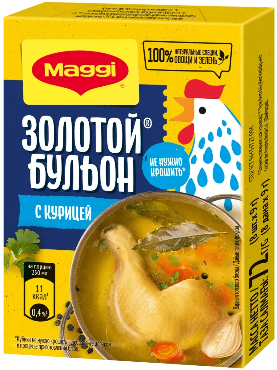 В каждом бульонном кубике идеально сбалансированы куриный и овощной вкусы, соль и тщательно подобранным букет пряностей и специй. Благодаря кубику ваши блюда приобретают вкус и аромат настоящего домашнего куриного бульона, а также аппетитный золотистый цвет. MAGGI ЗОЛОТОЙ Бульон с курицей теперь содержит только знакомые ингредиенты: натуральные овощи, зелень и НИКАКОГО ПАЛЬМОВОГО МАСЛА!