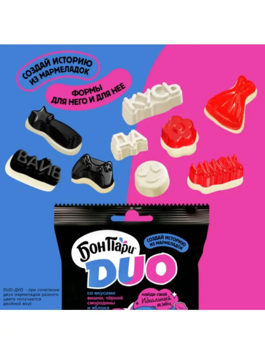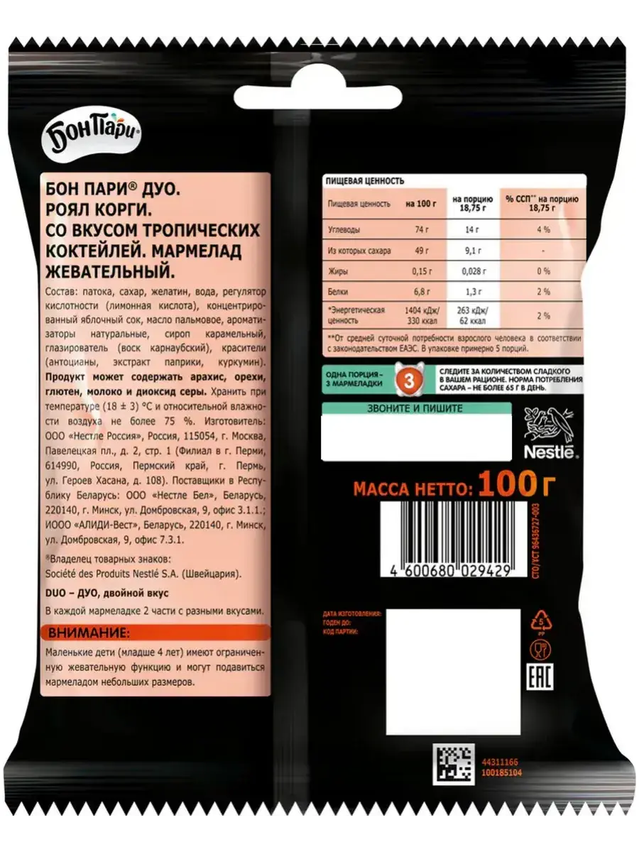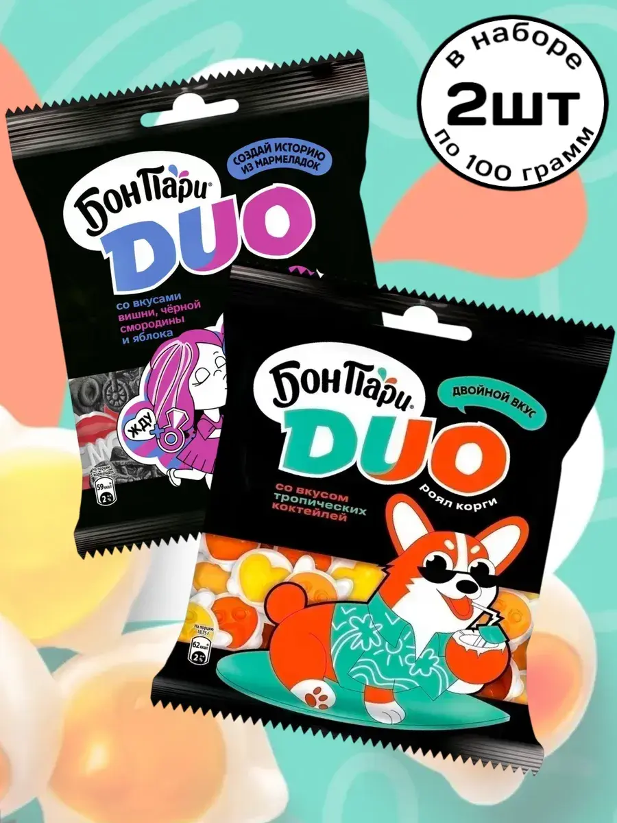 Лимитированная серия жевательного мармелада Бон Пари ДУО. Найди свой идеальный мэтч. Насыщенные вкусы вишни, чёрной смородины и яблока. Жевательный мармелад Бон Пари Дуо в форме собачек корги. Мармелад для тех, в ком жив внутренний ребенок: сладкая жевательная провокация в форме смешных корги: обаятельные мордочки и «сердечки» со вкусом тропических коктейлей: манго-кокос, лимон-кокос, апельсин-кокос, клубника-кокос. Замиксуй по-королевски, соедини две мармеладные половинки и получишь тропическую собачку-вкусняшку. Упаковку 100г удобно взять с собой или разделить с друзьями. Cледите за рекомендуемой порцией сладкого. Одна порция: две дуо-мармеладки. Мармелад производится без добавления искусственных красителей. В производстве используется концентрированный фруктовый сок.
