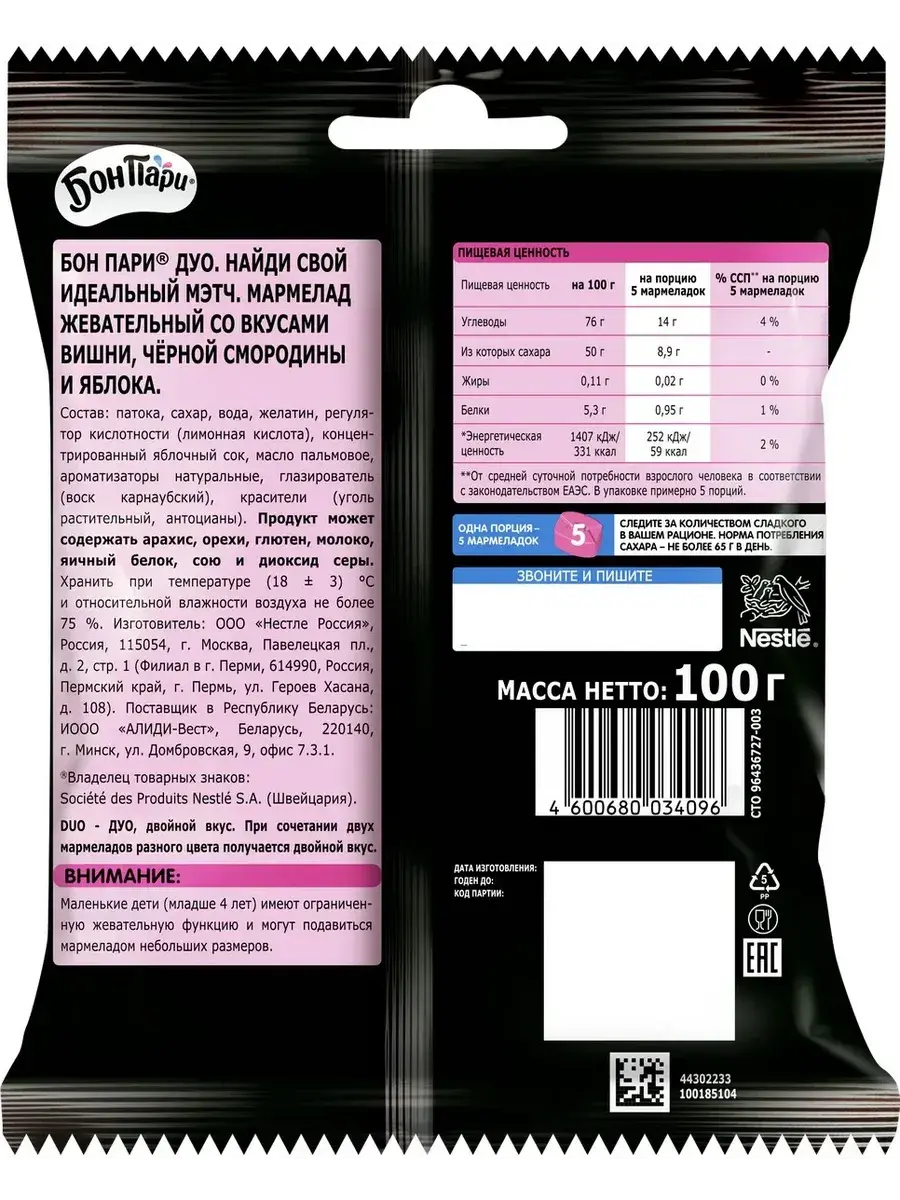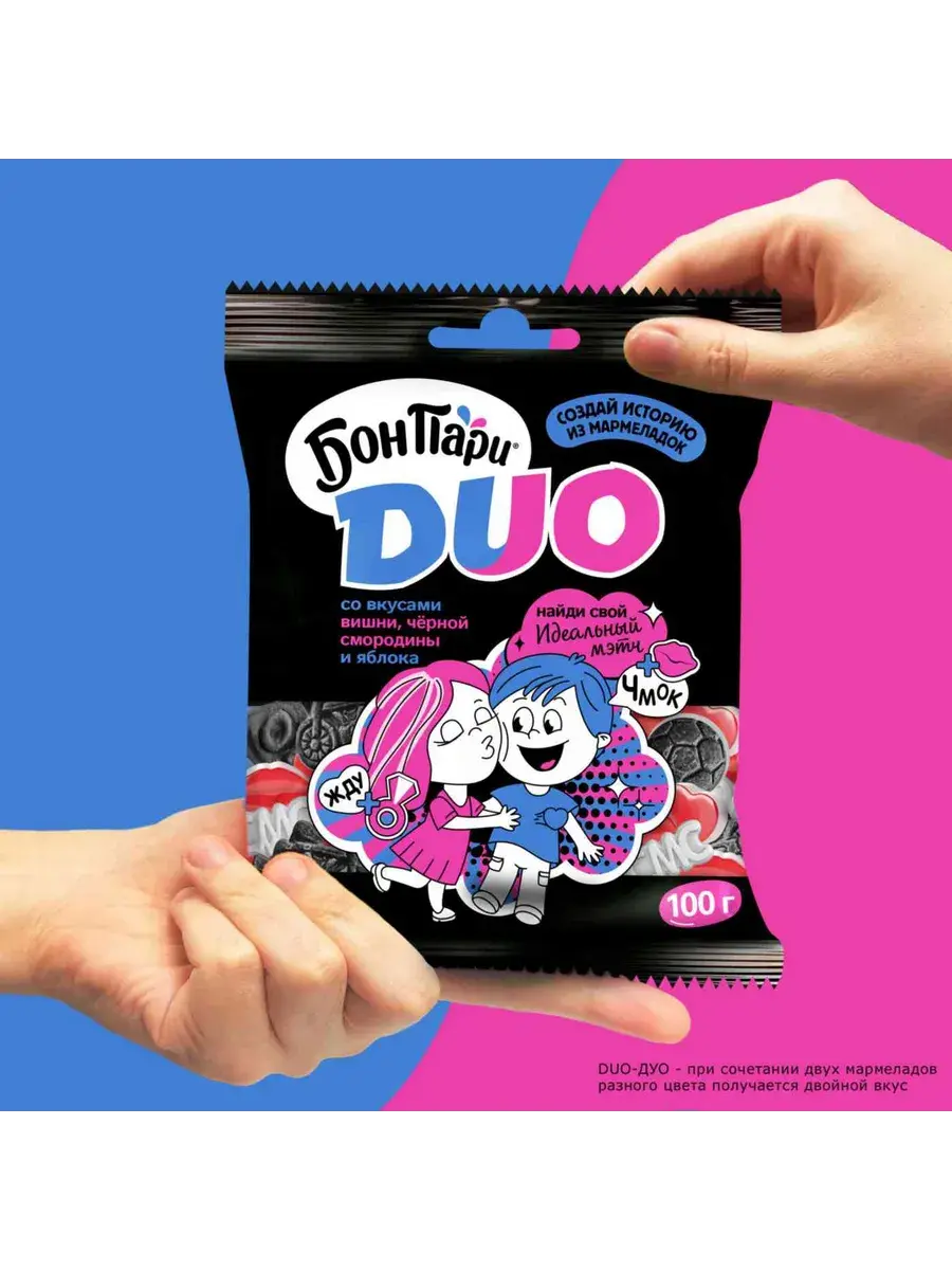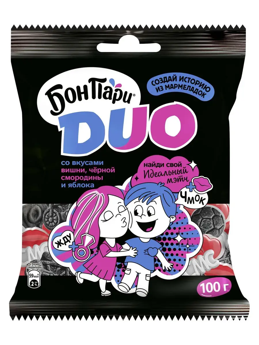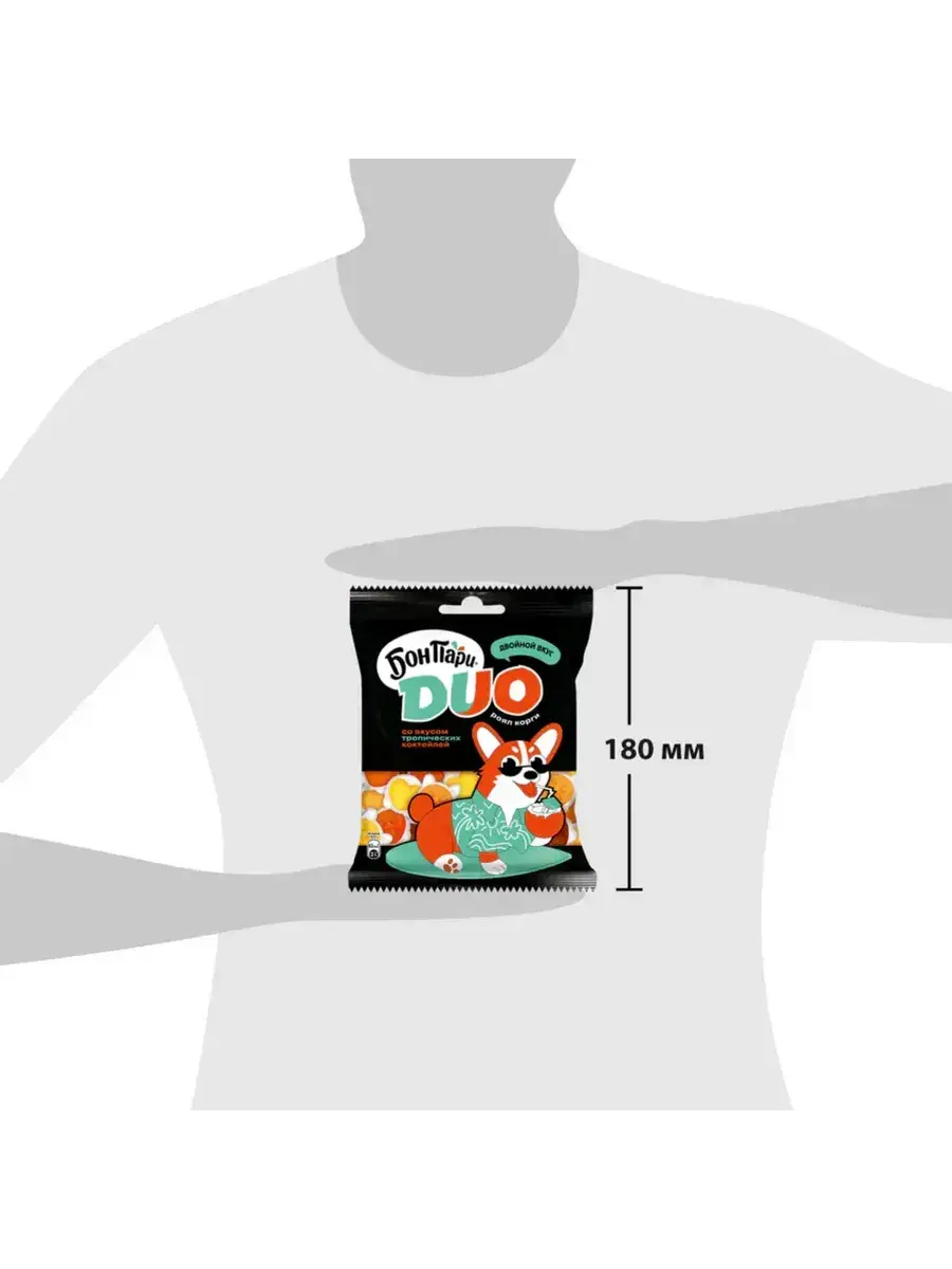Лимитированная серия жевательного мармелада Бон Пари ДУО. Найди свой идеальный мэтч. Насыщенные вкусы вишни, чёрной смородины и яблока. Жевательный мармелад Бон Пари Дуо в форме собачек корги. Мармелад для тех, в ком жив внутренний ребенок: сладкая жевательная провокация в форме смешных корги: обаятельные мордочки и «сердечки» со вкусом тропических коктейлей: манго-кокос, лимон-кокос, апельсин-кокос, клубника-кокос. Замиксуй по-королевски, соедини две мармеладные половинки и получишь тропическую собачку-вкусняшку. Упаковку 100г удобно взять с собой или разделить с друзьями. Cледите за рекомендуемой порцией сладкого. Одна порция: две дуо-мармеладки. Мармелад производится без добавления искусственных красителей. В производстве используется концентрированный фруктовый сок.
