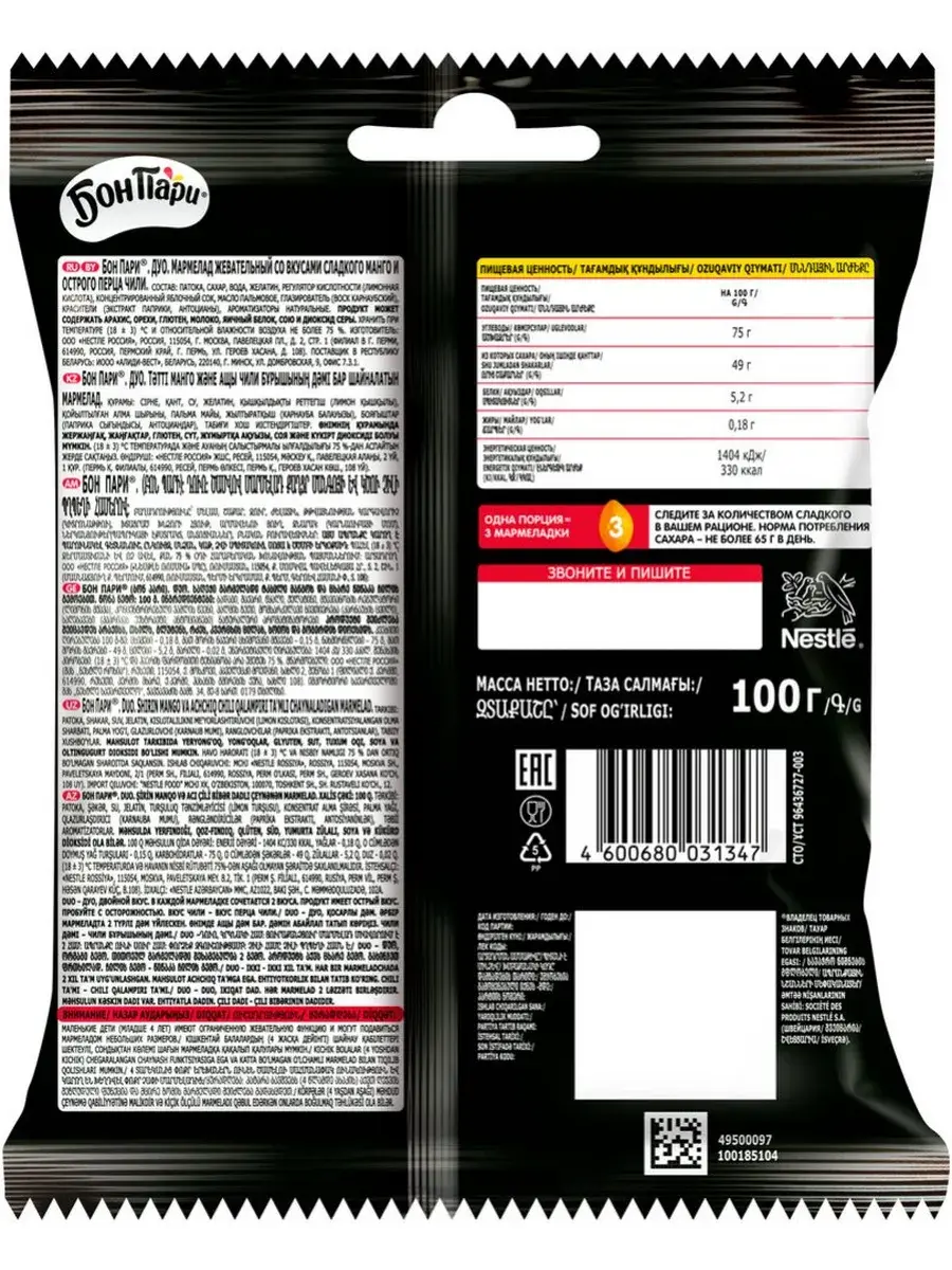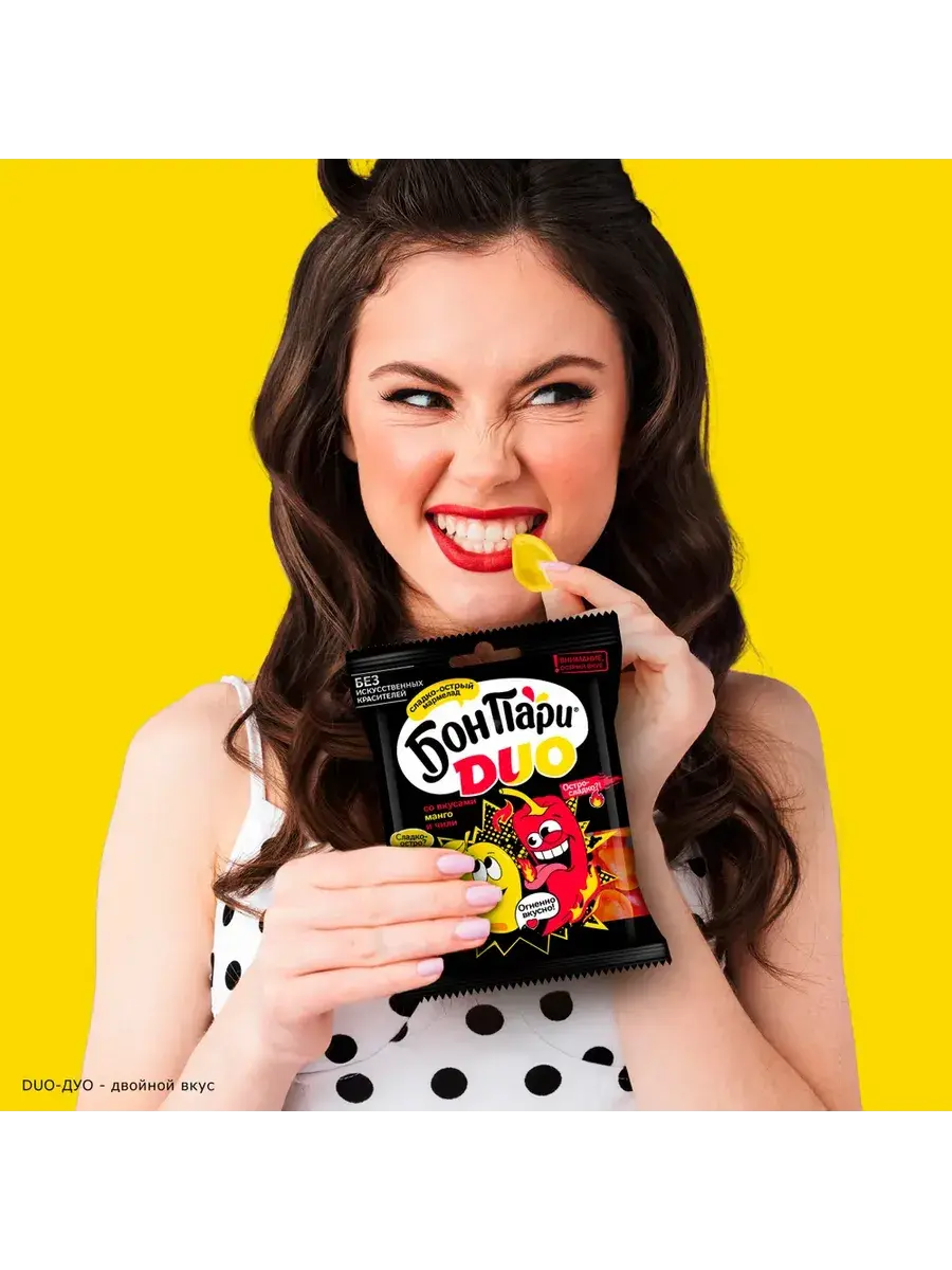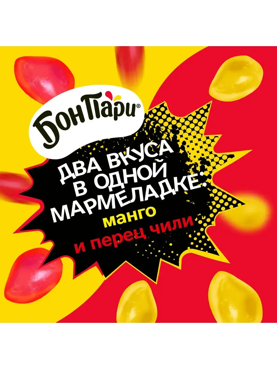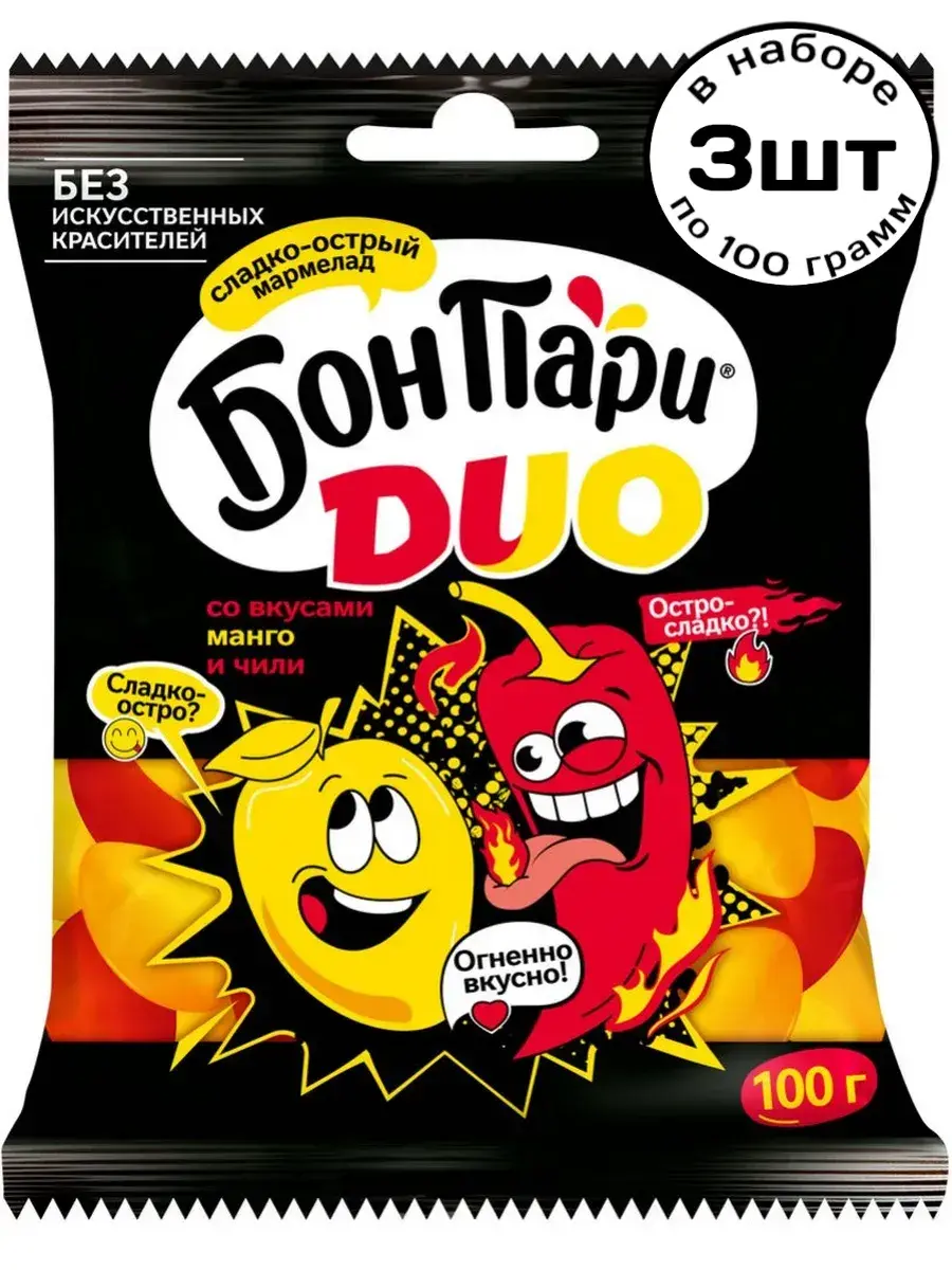 Бон Пари Duo Манго-Чили — когда вкус играет на контрасте! Мягкий жевательный мармелад с двойным характером: сначала — солнечно-сладкое манго, а следом — озорная искра чили! Это не просто угощение, это маленькое приключение для тех, кто любит острые ощущения и неожиданные повороты вкуса. Съедай по кусочку или собирай дуэт сам — миксуй, пробуй, удивляйся. Бон Пари Duo — играй со вкусом, как хочешь! Преврати дегустацию в мини-челлендж и узнай, кто из вас готов на «огненный» финал. В комплекте 3 пачки по 100г. Не забудьте угостить друзей!