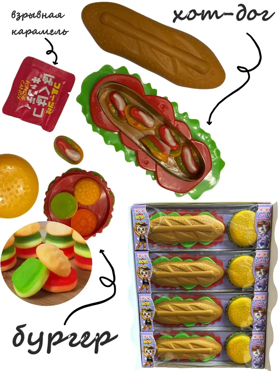 Готовы к настоящему гастрономическому приключению? Представляем вам жевательный мармелад в упаковках в форме хот-дога и бургера — это не просто сладость, это настроение! Игрушечные упаковки в виде бургера и хот-дога — открывай, собирай, играй, а потом угощайся вкусным мармеладом! Такая упаковка не просто хранит сладости, но и превращается в мини-игрушку, чтобы веселье длилось дольше. Сюрприз внутри — шипучая конфета! Она взрывается на языке и добавляет яркие эмоции! Идеально для перекуса или в подарок, который гарантированно вызовет улыбку. В комплекте 5 пачек (хот-дог + бургер) по 28г.