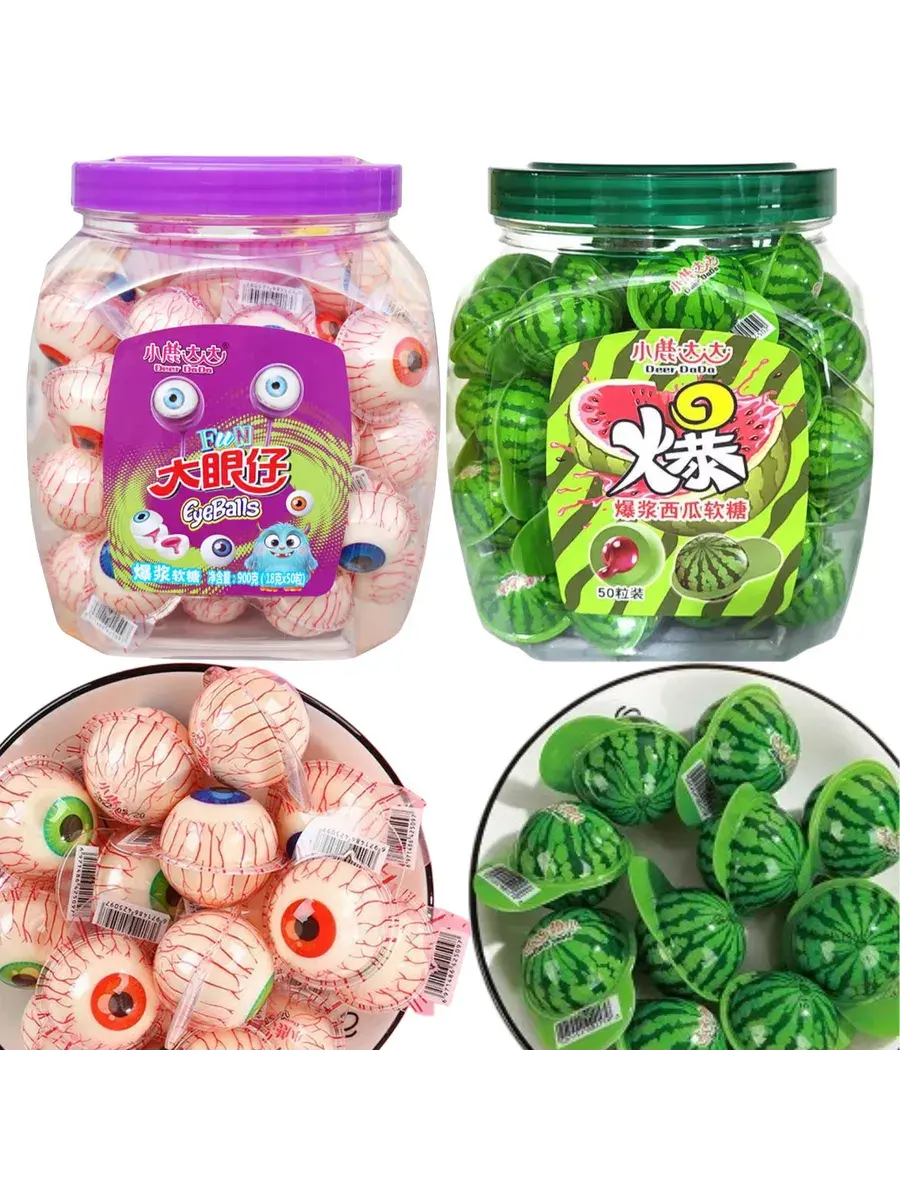 Уважаемые любители вкусняшек из Китая! Представляем вам жевательный мармелад с жидкой начинкой в уникальном формате глаз и арбузиков! Этот мармелад - настоящий кулинарный праздник, который порадует и ваши глаза, и ваши вкусовые рецепторы. Идеально подходят для подарков, вечеринок или просто для того, чтобы порадовать своего малыша. Приготовьтесь к приключению каждый раз, когда вы открываете одну из волшебных банок. Погрузитесь в мир фантазии и веселья, наслаждаясь каждым кусочком мармелада, который тает во рту, раскрывая свой неповторимый вкус. В комплекте 2 пластиковые банки. В каждой банке по 50шт.