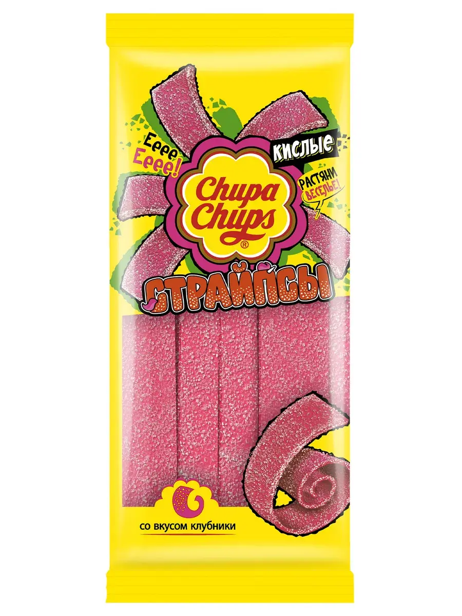 Мармелад Chupa Chups Страйпсы – это яркое и взрывное сочетание спелой клубники и бодрящей кислой обсыпки, которое точно не оставит тебя равнодушным! Мармеладки в виде длинных тянучих лент не только вкусные, но и невероятно весёлые. Их удобно брать с собой — компактная упаковка легко помещается в сумке, рюкзаке или даже кармане. Поделись этим ярким вкусом с друзьями: потяни, сверни, откуси — и почувствуй, как по вкусовым рецепторам пробегает сладко-кислое «Ееее!». Настроение обеспечено! Длинные, тянущиеся — они превращают каждый перекус в весёлую игру.