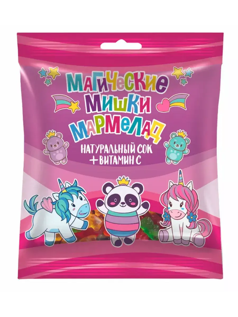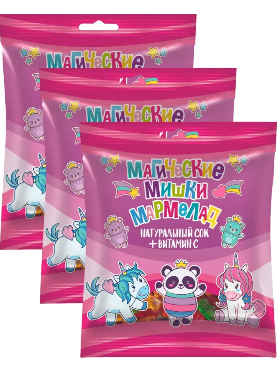 Любимая еда жителей Волшебной страны — это, конечно, мармелад! Натуральный и вкусный, в форме мишек, с нежным фруктовым вкусом — фигурный жевательный мармелад — это любимое лакомство во всем мире! Жевательный мармелад любят не только дети, но и взрослые. Это замечательный полезный перекус и милый гостинец для любого случая. Магический мармелад не содержит искусственных добавок и красителей, а также полностью безопасен при непереносимости глютена и лактозы. Кроме того в состав мармелада входит натуральный сок и необходимый в ежедневном рационе витамин С, который повышает иммунитет и способствует здоровому гармоничному росту и развитию. В комплекте 3 пачки по 90г.