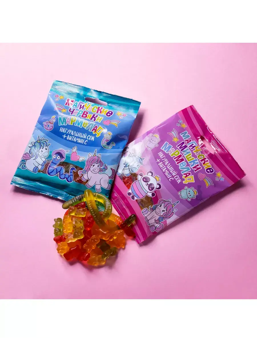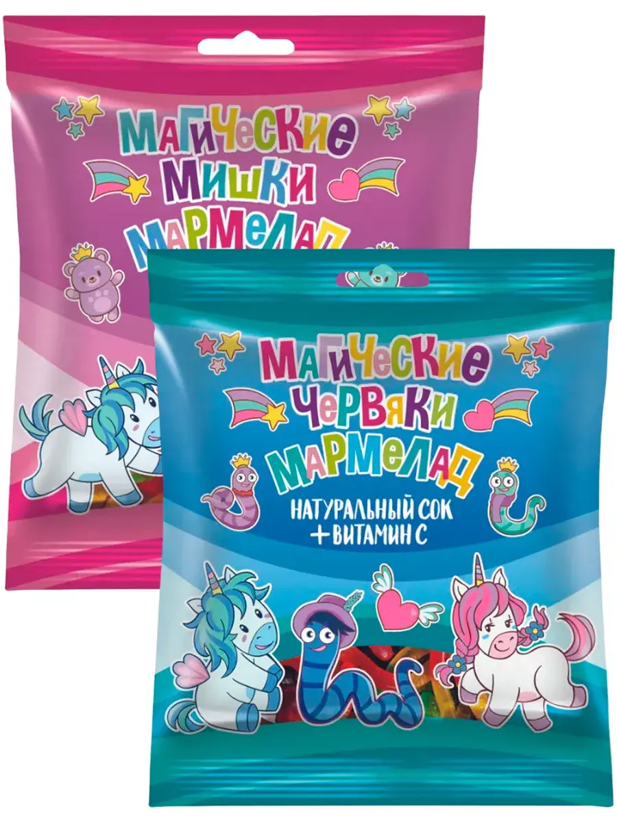 Любимая еда жителей Волшебной страны — это, конечно, мармелад! Натуральный и вкусный, в форме мишек и червячков, с нежным фруктовым вкусом — фигурный жевательный мармелад — это любимое лакомство во всем мире! Жевательный мармелад любят не только дети, но и взрослые. Это замечательный полезный перекус и милый гостинец для любого случая. Магический мармелад не содержит искусственных добавок и красителей, а также полностью безопасен при непереносимости глютена и лактозы. Кроме того в состав мармелада входит натуральный сок и необходимый в ежедневном рационе витамин С, который повышает иммунитет и способствует здоровому гармоничному росту и развитию.