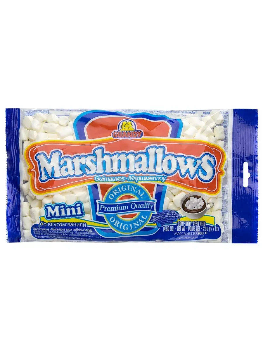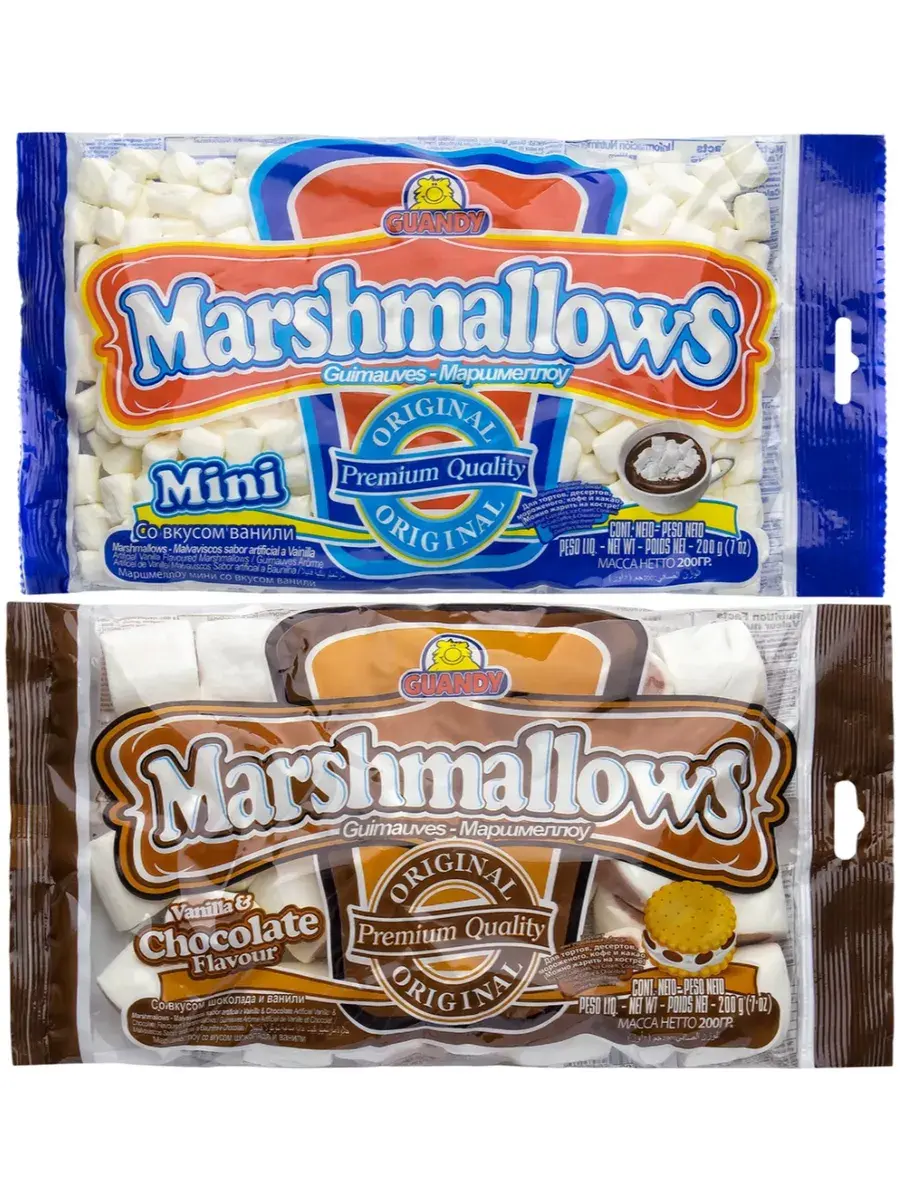 Маршмеллоу GUANDY — настоящий маршмеллоу, сделанный в Гватемале, известный и популярный во всем мире. Не каждый производитель способен повторить особую температурную формулу, а ведь именно она придает идеальную упругость и нежный ванильный вкус. Классический мягкий ванильный маршмеллоу, представленный в мини-кусочках можно добавлять в горячий шоколад, какао, кофе, коктейли. Растворяясь в напитках, мини-маршмеллоу превращается в нежное ванильное облако! Этот вид маршмеллоу также используется для приготовления мастики и кондитерских украшений или как топпинг. В шоколадном маршмеллоу под мягким ванильным слоем скрывается нежный шоколадный центр с приятным запахом и вкусом какао. Это придает шоколадные ноты уже привычному оригинальному вкусу маршмеллоу. В комплекте 2 пачки по 200г.