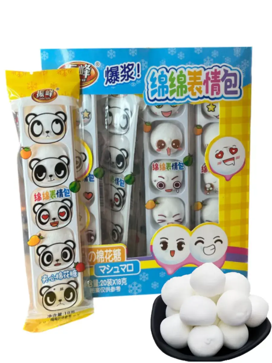 Маршмеллоу - это популярный вид конфет, которые имеют нежную, воздушную текстуру и мягкий, сливочный вкус. Такие зефирки очень нравятся детям! Фруктовый вкус начинки и забавная упаковка с изображением мордашек гарантируют настроение. Различные эмоции пандочек, человечков -это все вы можете разглядеть на индивидуальных упаковках. У каждой упаковки свой дизайн, при этом все маршмеллоу без рисунка, белого цвета.