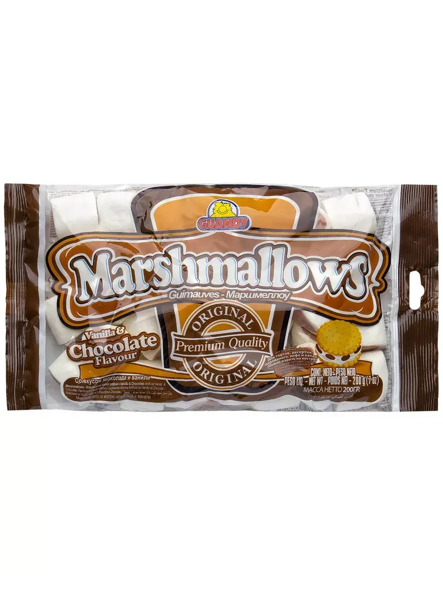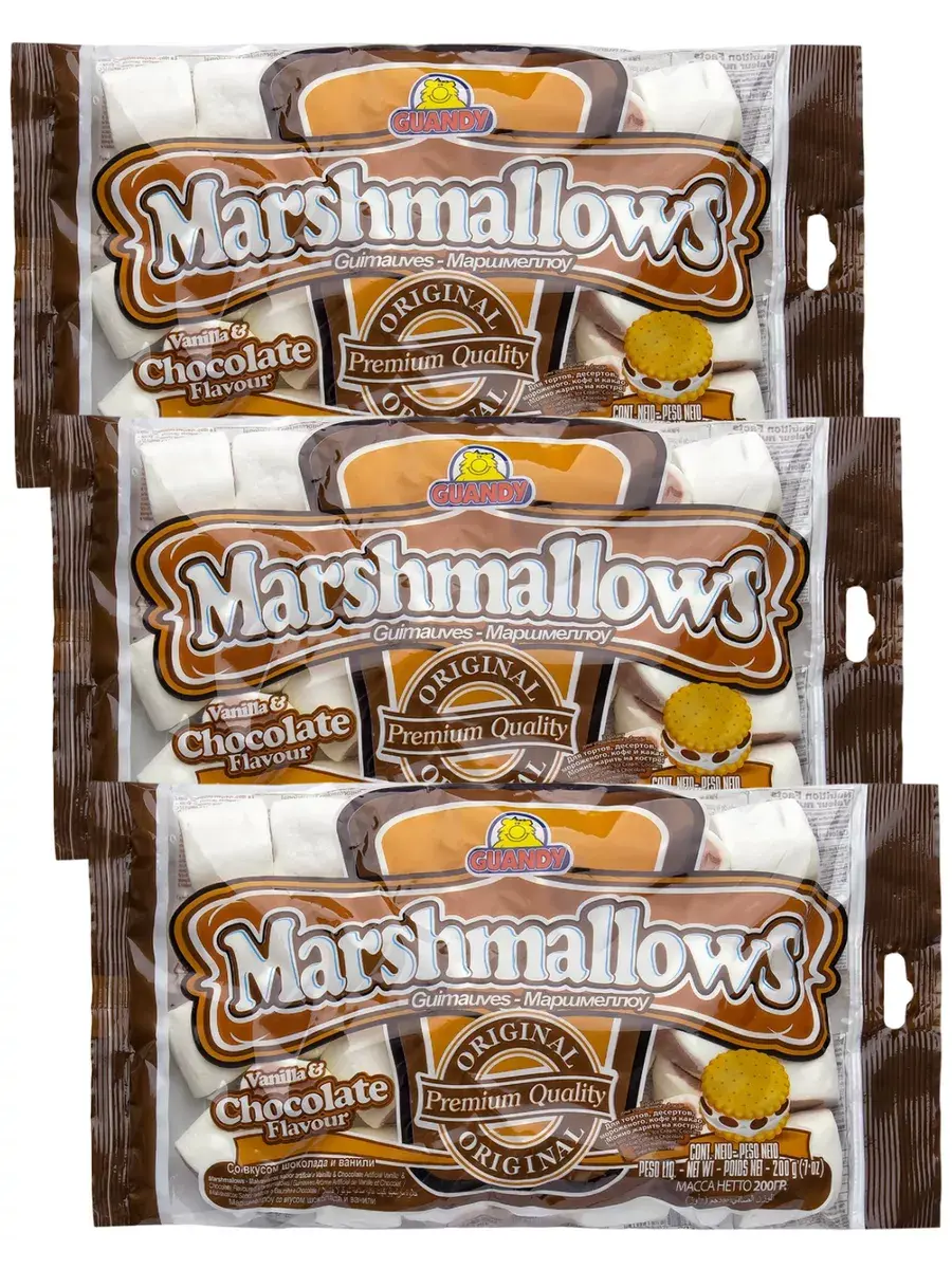 Маршмеллоу GUANDY — настоящий маршмеллоу, сделанный в Гватемале, известный и популярный во всем мире. Не каждый производитель способен повторить особую температурную формулу, а ведь именно она придает идеальную упругость и нежный ванильный вкус. В шоколадном маршмеллоу под мягким ванильным слоем скрывается нежный шоколадный центр с приятным запахом и вкусом какао. Это придает шоколадные ноты уже привычному оригинальному вкусу маршмеллоу. Теперь ваши тосты с маршмеллоу будут не просто нежно-ванильными, а ванильно-шоколадными! В комплекте 3 пачки по 200г.