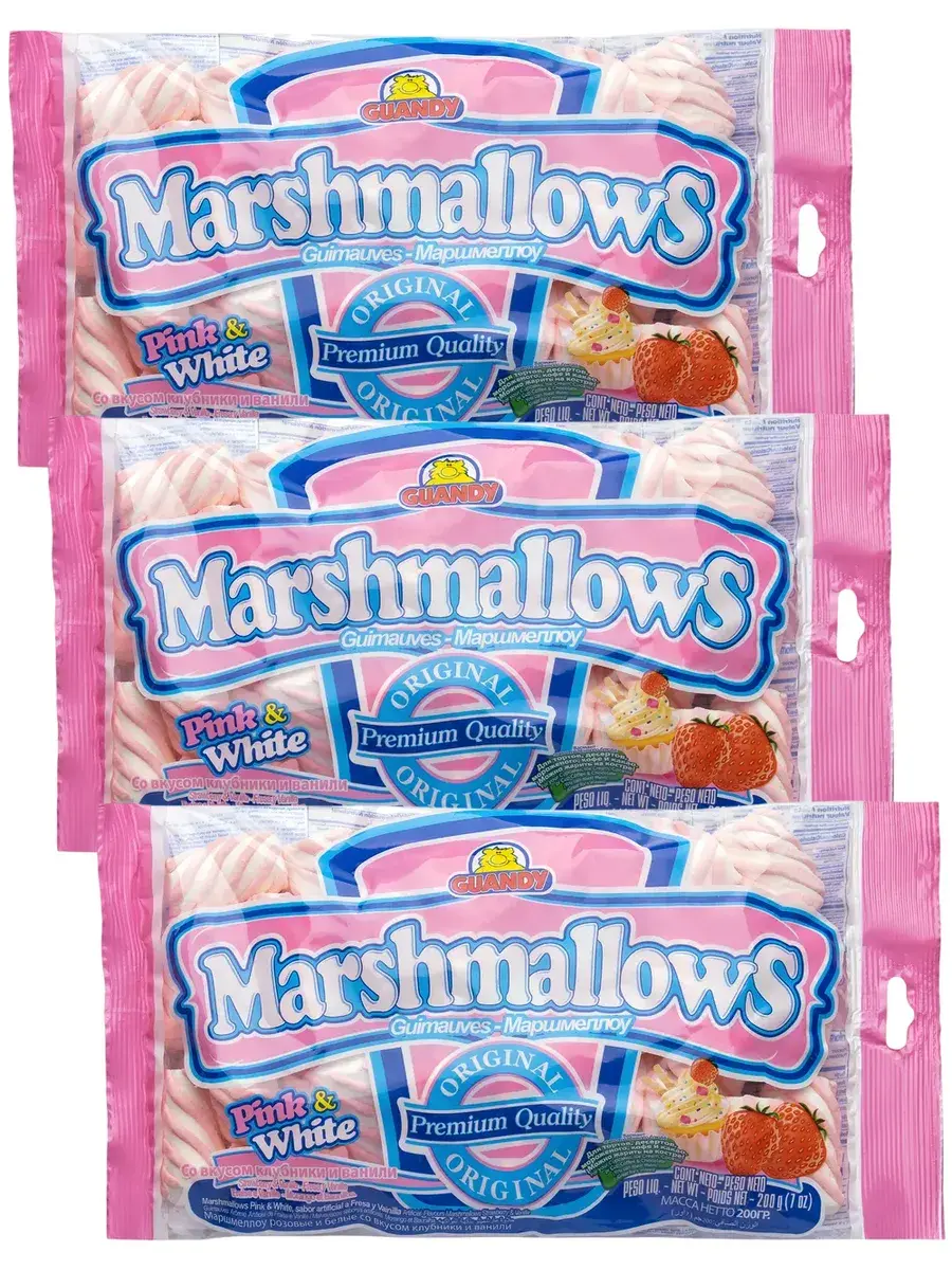 Выполненный в интересной форме спиралек с нежным клубнично-ванильным вкусом, этот вид маршмеллоу Guandy можно жарить на костре, плавить в духовке или микроволновой печи, есть прямо из пачки! Он обязательно станет одним из ваших любимых лакомств и украсит собой ваши десерты, кондитерские букеты, фруктовые салаты, мороженое или напитки! Нет ничего проще, чем создать уют и праздничное настроение с маршмеллоу Guandy! Без жира. Без глютена. Без лактозы. Без яичного белка. Клубничные зефирки изготовлены на основе высококачественного говяжьего желатина с сертификацией "Халяль". В комплекте 3 пачки по 200г.