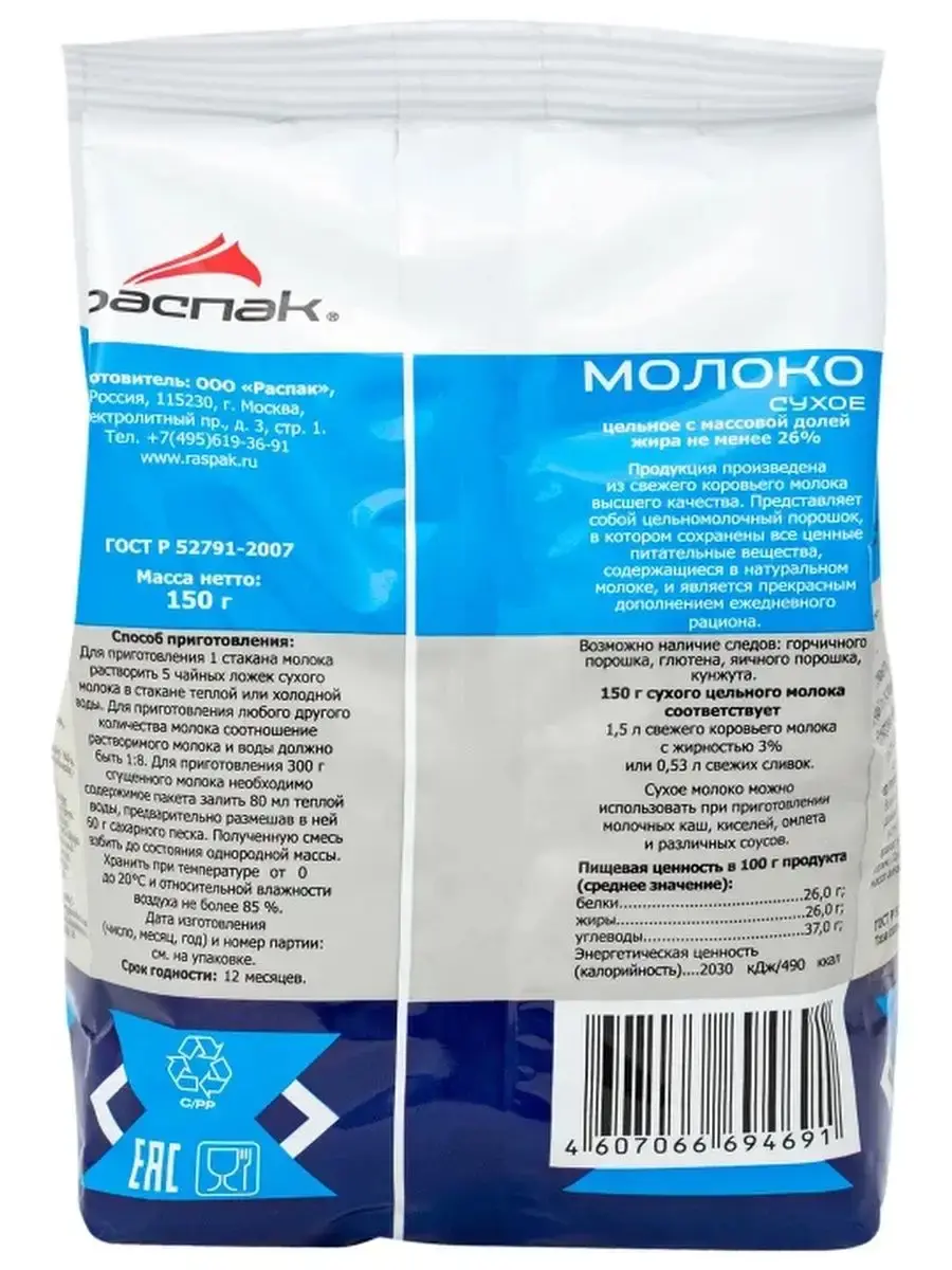 Молоко сухое цельное с массовой долей жира не менее 26%. Продукция произведена из свежего коровьего молока высшего качества. Представляет собой цельномолочный порошок, в котором сохранены все ценные питательные вещества, содержащиеся в натуральном молоке, и является прекрасным дополнением ежедневного рациона.