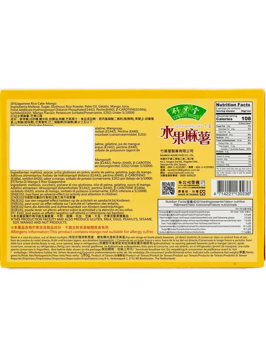 Японское рисовое пирожное моти со вкусом манго станет настоящим открытием для ценителей изысканных десертов и любителей оригинальных вкусов. Это не просто пирожное, это настоящий символ японской культуры, сочетающий в себе свежесть и сладость, а также неповторимый вкус манго. В основе этого продукта лежит рисовая мука, которая придает пирожному особую нежность и текстуру. С каждым кусочком моти Вы сможете насладиться гармонией идеального сочетания ингредиентов. Благодаря своим превосходным вкусовым качествам и уникальному составу, моти станет идеальным дополнением к любому чаепитию, как в качестве самостоятельного десерта, так и в качестве приятного подарка. В комплекте 1 пачка, весом 180г, в которой 6шт моти.