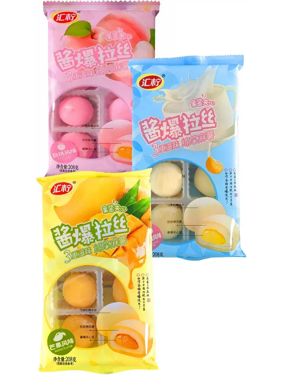 В комплекте 1 упаковка со вкусом персика, 1 упаковка со вкусом сливочного крема и 1 упаковка со вкусом манго по 208г. В каждом лотке 8 штук моти.