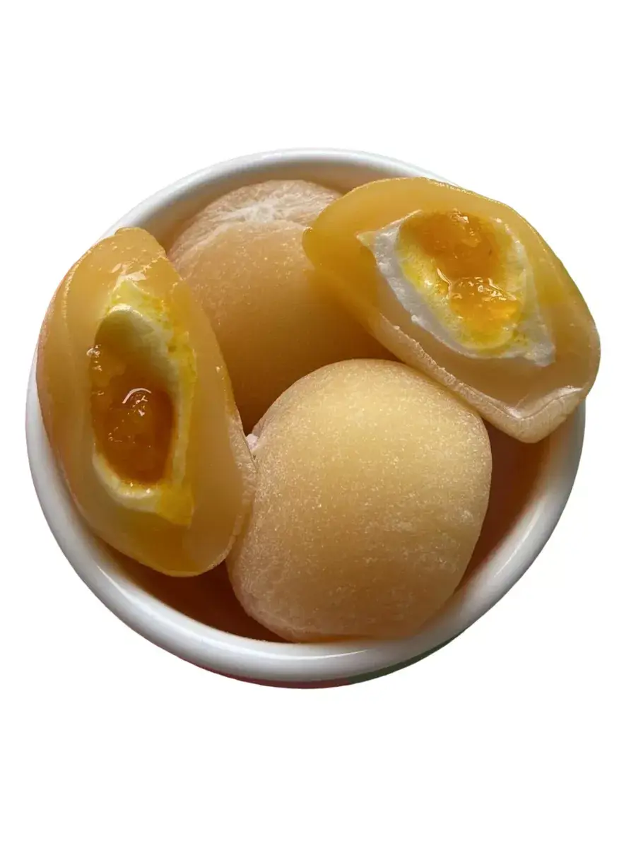 Рисовые пирожные Моти с нежной начинкой, раскрывающей аромат персика и манго - это истинное удовольствие для всех, кто ценит утонченные вкусовые сочетания и традиционные японские сладости. При первом прикосновении клейкое рисовое тесто обнимает вас, словно ласкающий ветер весеннего утра. Аромат персика и манго пробуждает воспоминания о теплых летних днях и наполняет каждый уголок вашего воображения. Но настоящее волшебство начинается, когда вы достигаете сердца пирожного. Нежная начинка, изысканно пропитанная вкусом спелого манго, раскрывается, заливая ваше воображение свежестью и сладостью. А нежная начинка сливочного крема, будто бы взбитого до идеальной консистенции, прячет в себе магию насыщенного вкуса молока и нежной сливочной пенки. Аромат сливочного крема пробуждает воспоминания о детстве и создает вкусовой портал в мир удовольствия.