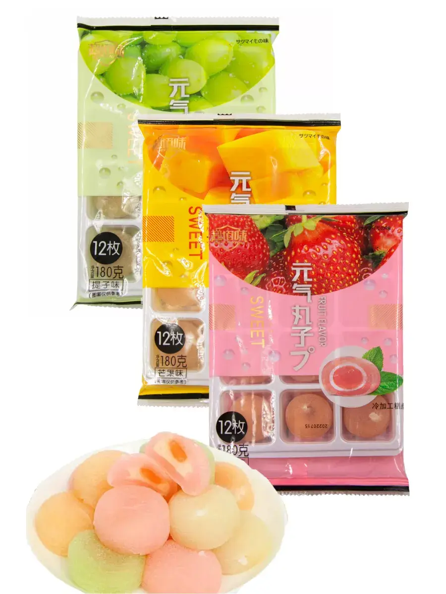 Пирожное Моти (Мочи) - это японское традиционное лакомство из рисового теста с начинкой внутри. Этот десерт отличается необычным вкусом и текстурой, благодаря мягкой консистенции рисовой основы и сочному фруктовому наполнителю. Азиатский десерт моти имеет очень интересный вкус, который должен попробовать каждый! Многие выбирают эти вкусности вместо обычных сладостей, поскольку моти считаются более низкокалорийными и идеальны для людей, следящих за своим питанием. В каждой упаковке 12 штук моти. В коробке 3 индивидуальные упаковки ассорти вкусов: виноград, манго и клубника.