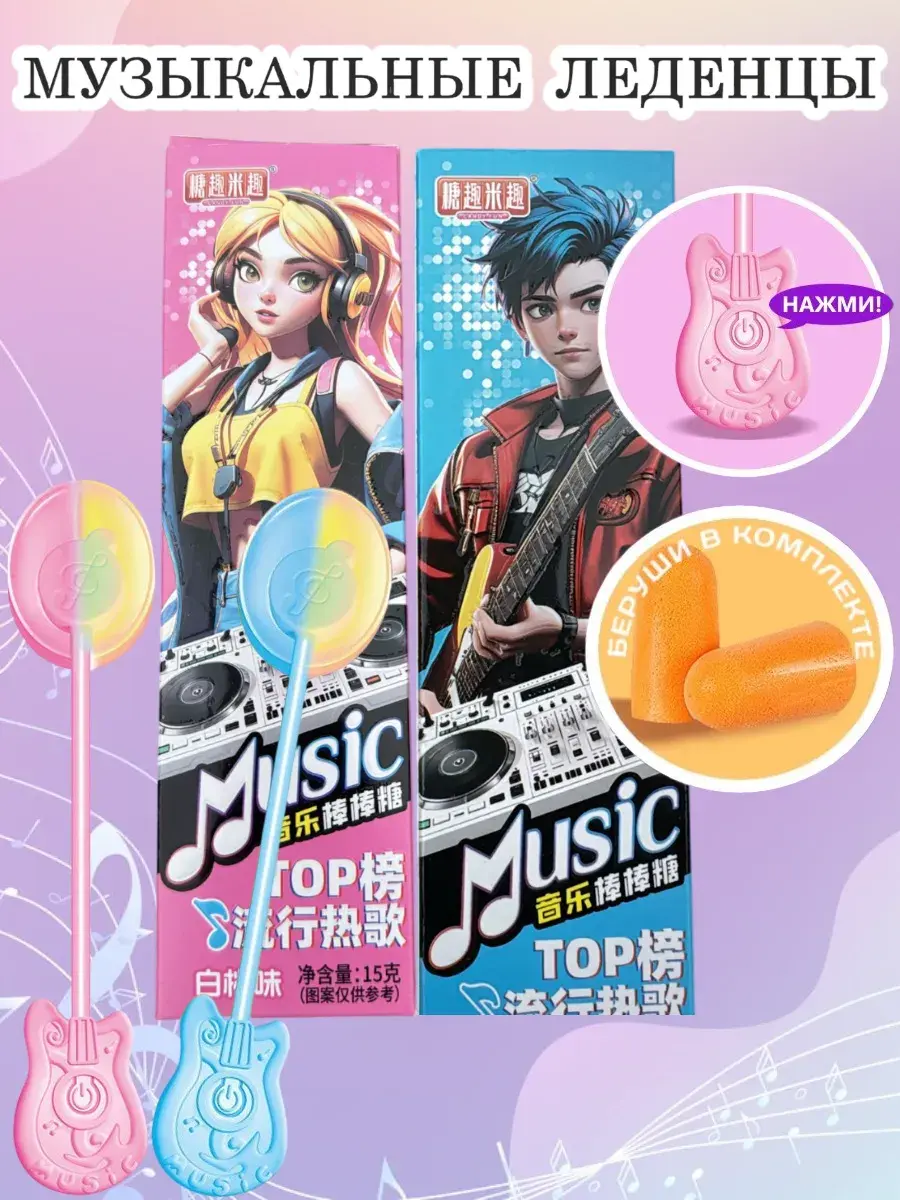 Музыкальные леденцы на палочке — это нечто совершенно новое и захватывающее. Каждая конфетка , аналогично наушникам, передает звук через вибрации. Попробовав ее, вы почувствуете, как мелодия проникает в сердце. 1. Нажмите переключатель (на гитаре) чтобы начать воспроизведение. 2. Положите в рот и осторожно разжуйте. 3. Нажмите переключатель, чтобы приостановить воспроизведение. 4. Нажмите и удерживайте переключатель в течение двух секунд, чтобы перейти к следующему треку. 5. Автоматически останавливаться, когда музыка заканчивается. 6. В комплект входят беруши. Почему это нужно попробовать: Это уникальный подарок, от которого будут в восторге дети и взрослые. Это новые ощущения, которых вы никогда не испытывали. Это музыка, которую можно буквально "попробовать на вкус".