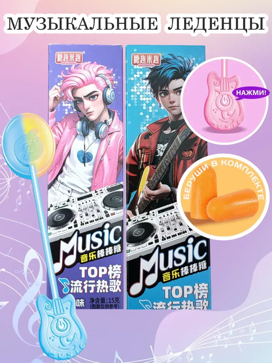 Музыкальные леденцы на палочке — это нечто совершенно новое и захватывающее. Каждая конфетка , аналогично наушникам, передает звук через вибрации. Попробовав ее, вы почувствуете, как мелодия проникает в сердце. 1. Нажмите переключатель (на гитаре) чтобы начать воспроизведение. 2. Положите в рот и осторожно разжуйте. 3. Нажмите переключатель, чтобы приостановить воспроизведение. 4. Нажмите и удерживайте переключатель в течение двух секунд, чтобы перейти к следующему треку. 5. Автоматически останавливаться, когда музыка заканчивается. 6. В комплект входят беруши. Почему это нужно попробовать: Это уникальный подарок, от которого будут в восторге дети и взрослые. Это новые ощущения, которых вы никогда не испытывали. Это музыка, которую можно буквально "попробовать на вкус".