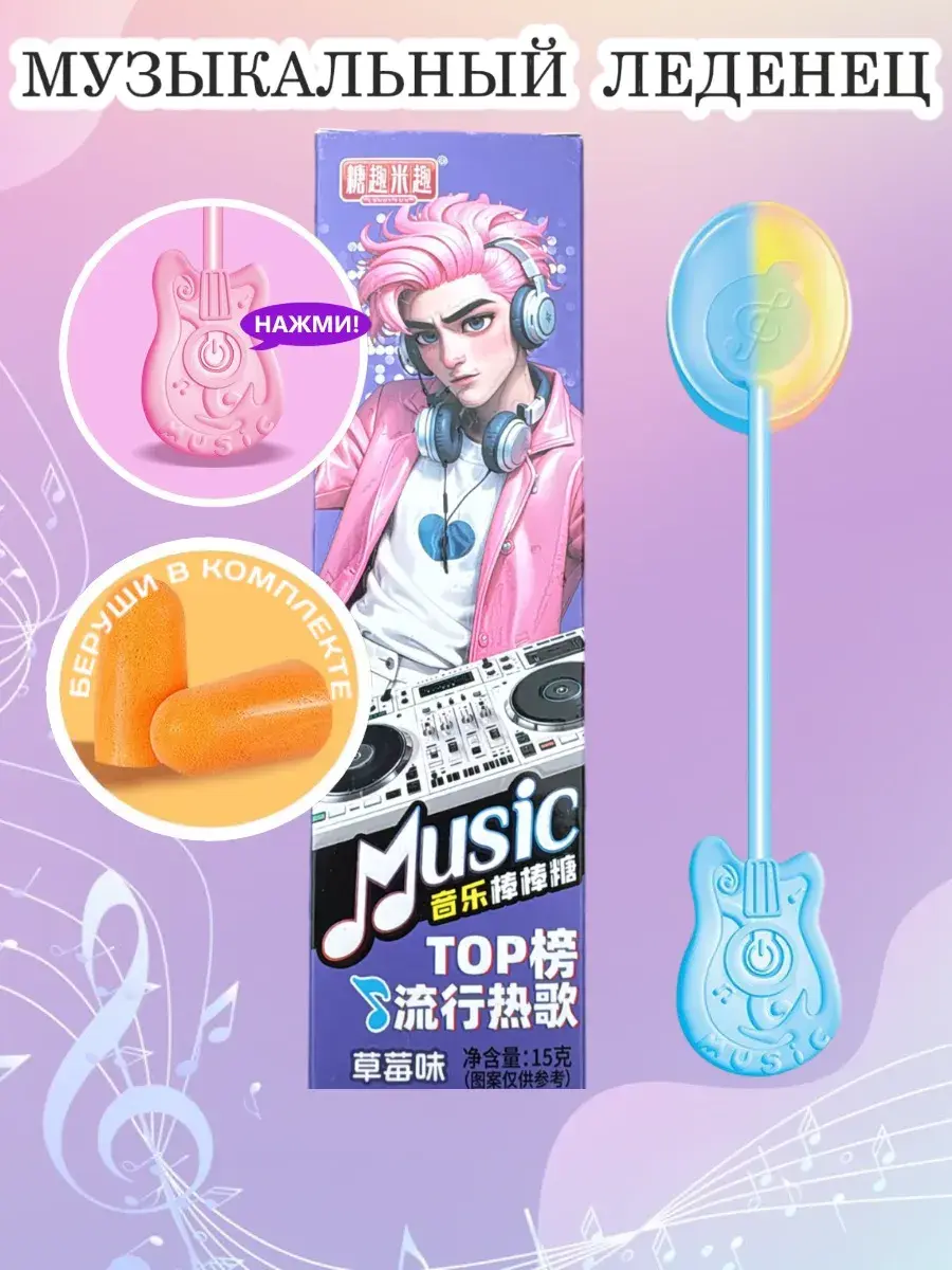 Музыкальные леденцы на палочке — это нечто совершенно новое и захватывающее. Каждая конфетка , аналогично наушникам, передает звук через вибрации. Попробовав ее, вы почувствуете, как мелодия проникает в сердце. 1. Нажмите переключатель (на гитаре) чтобы начать воспроизведение. 2. Положите в рот и осторожно разжуйте. 3. Нажмите переключатель, чтобы приостановить воспроизведение. 4. Нажмите и удерживайте переключатель в течение двух секунд, чтобы перейти к следующему треку. 5. Автоматически останавливаться, когда музыка заканчивается. 6. В комплект входят беруши. Почему это нужно попробовать: Это уникальный подарок, от которого будут в восторге дети и взрослые. Это новые ощущения, которых вы никогда не испытывали. Это музыка, которую можно буквально "попробовать на вкус".