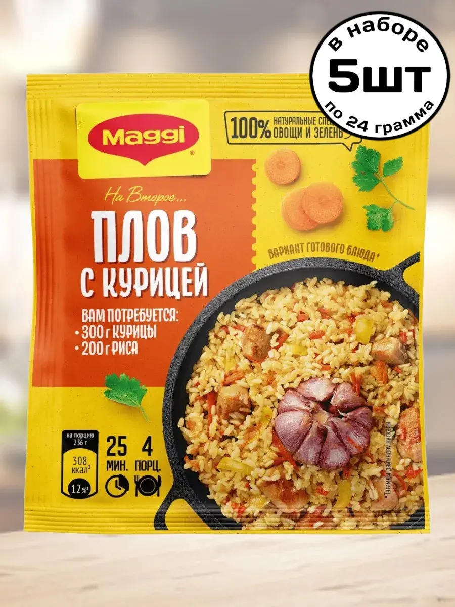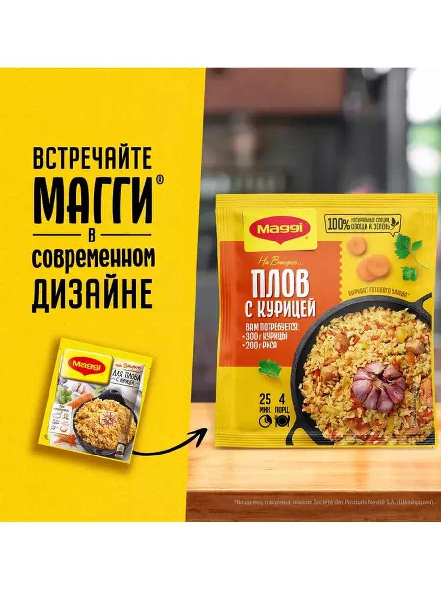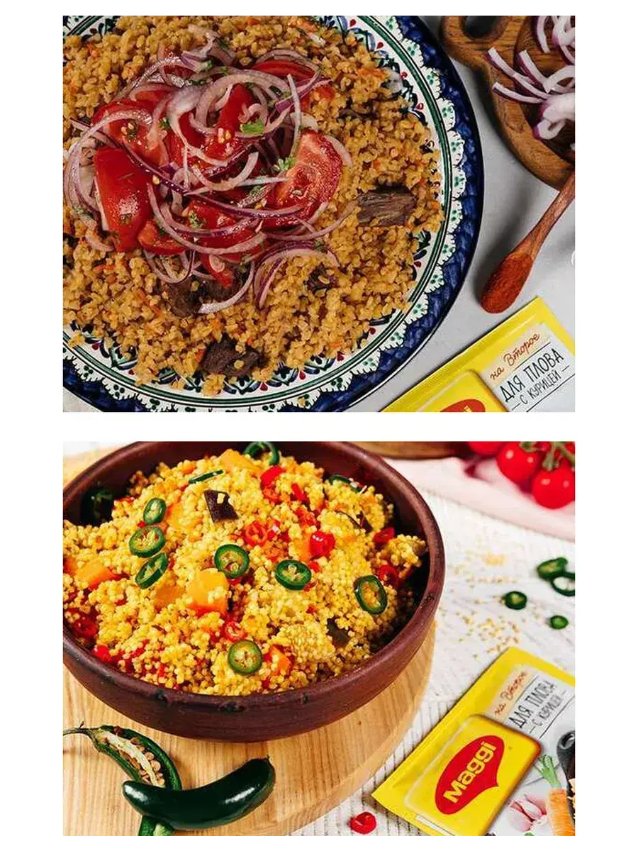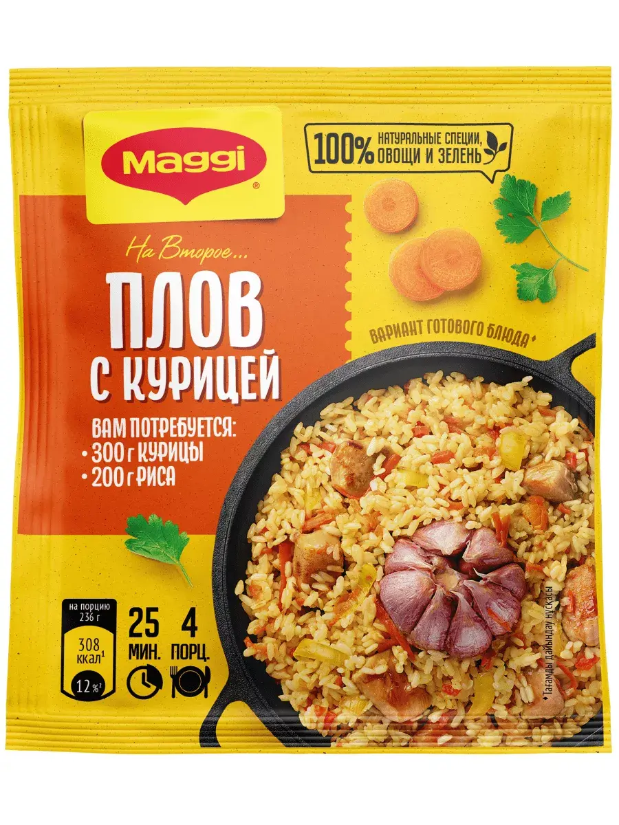 MAGGI На второе предлагает вам замечательный рецепт плова с курицей для приготовления без лишних хлопот. Тщательно подобранная композиция натуральных овощей, ароматных трав и пряных специй и пошаговая инструкция помогут вам приготовить гарантировано вкусное блюдо для всей семьи.