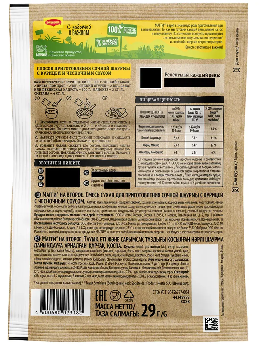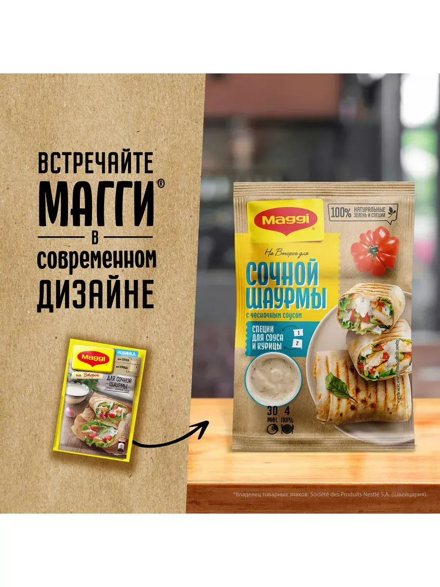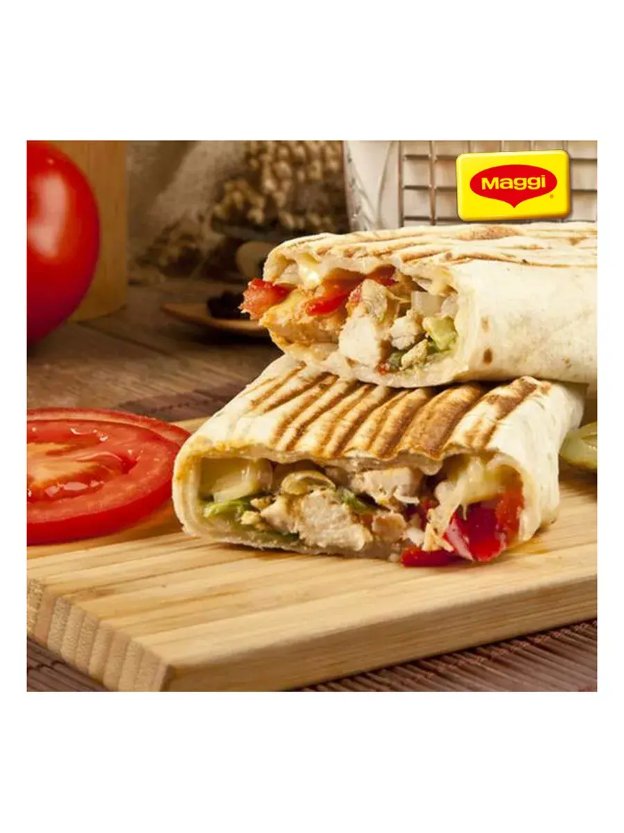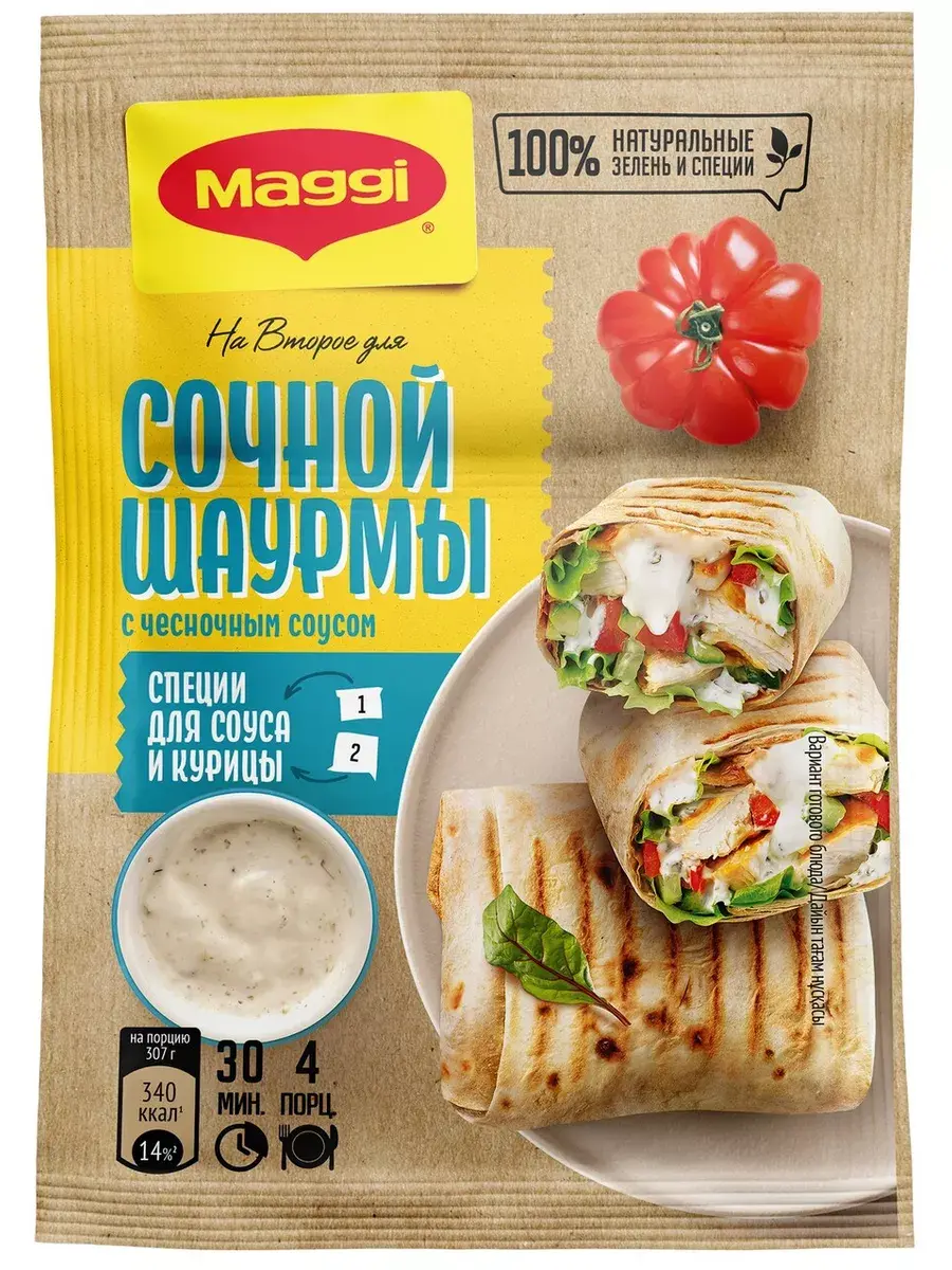 И снова вопрос: что новенького приготовить на ужин? MAGGI на второе для сочной шаурмы с курицей и чесночным соусом – это легкий способ приготовить вкусную и сочную шаурму дома с пошаговым рецептом из натуральных и качественных ингредиентов. В пакетике MAGGI на Второе сразу две подобранных смеси из овощей, ярких трав и пряных специй: для нежного чесночного соуса и для обжарки курочки в пикантных ароматных специях. Сочетание свежих овощей, ароматного и пикантного куриного филе в специях, нежного чесночного соуса и тонкого лаваша послужит вам сбалансированным обедом или ужином.