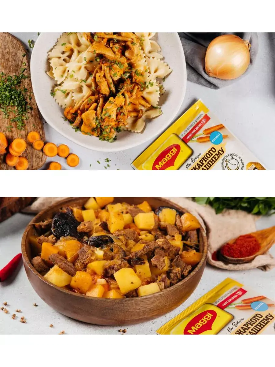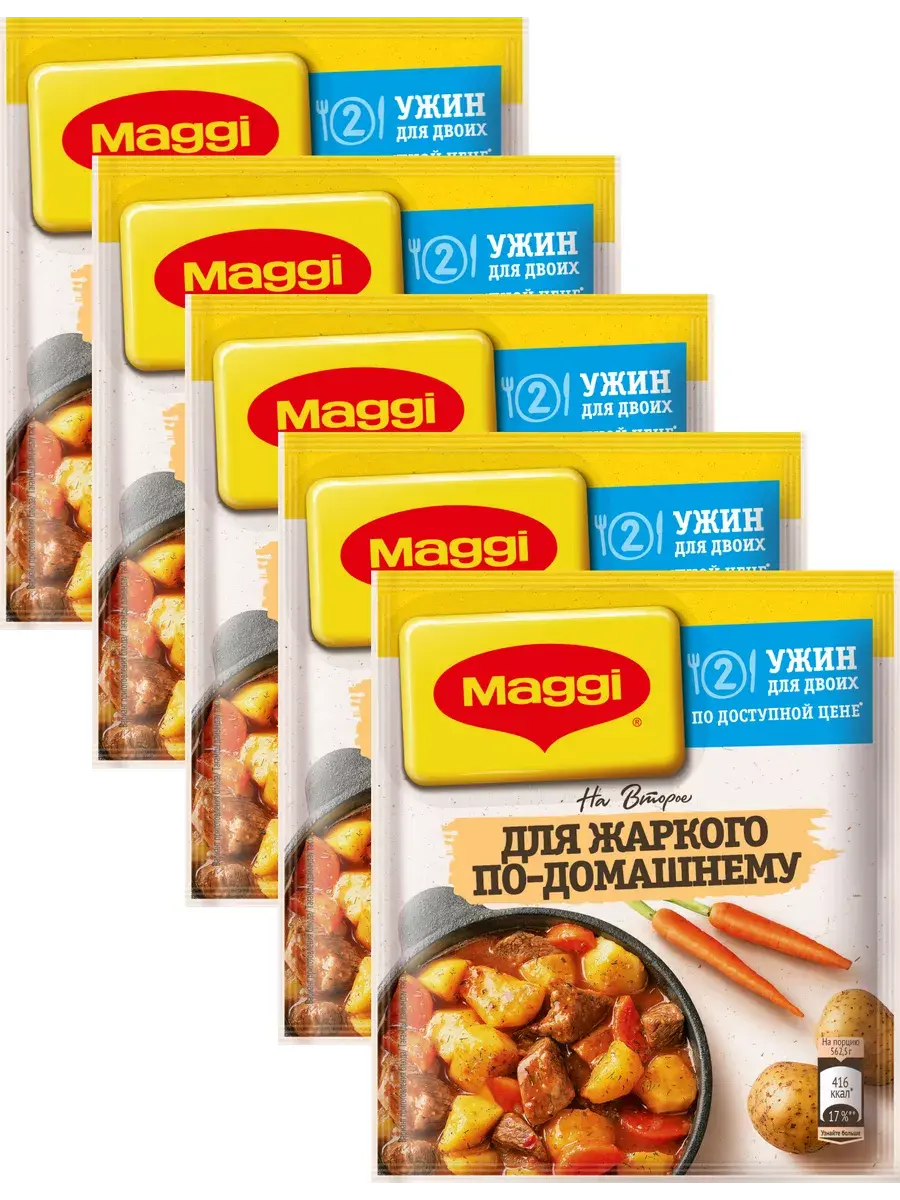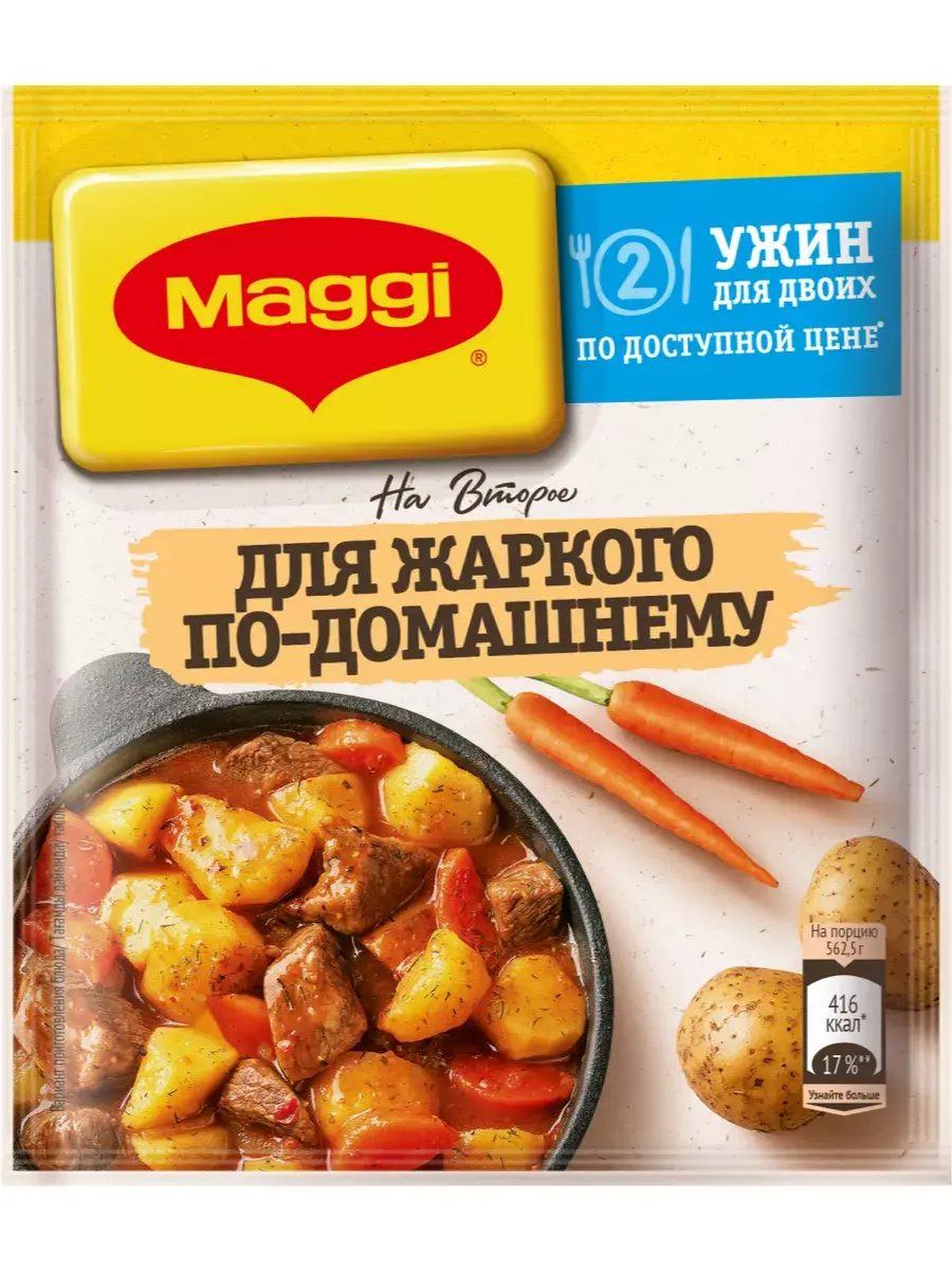 MAGGI на второе для жаркого по-домашнему – вкусное решение для простого ужина на двоих из доступных ингредиентов. Если хочется чего-нибудь сытного на ужин, на помощь придет MAGGI на второе для жаркого по-домашнему. Благодаря сбалансированной смеси из натуральных трав и специй в составе блюдо получится гарантированно вкусным. Просто потушите в 1 сковородке картошку с мясом, луком и морковью, добавьте MAGG. И получите сытный и вкусный ужин на двоих без лишних усилий. Просто, Вкусно, Доступно!
