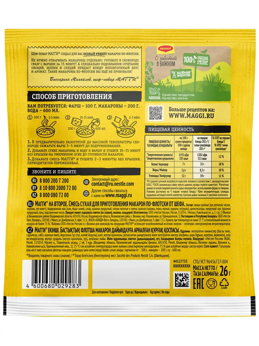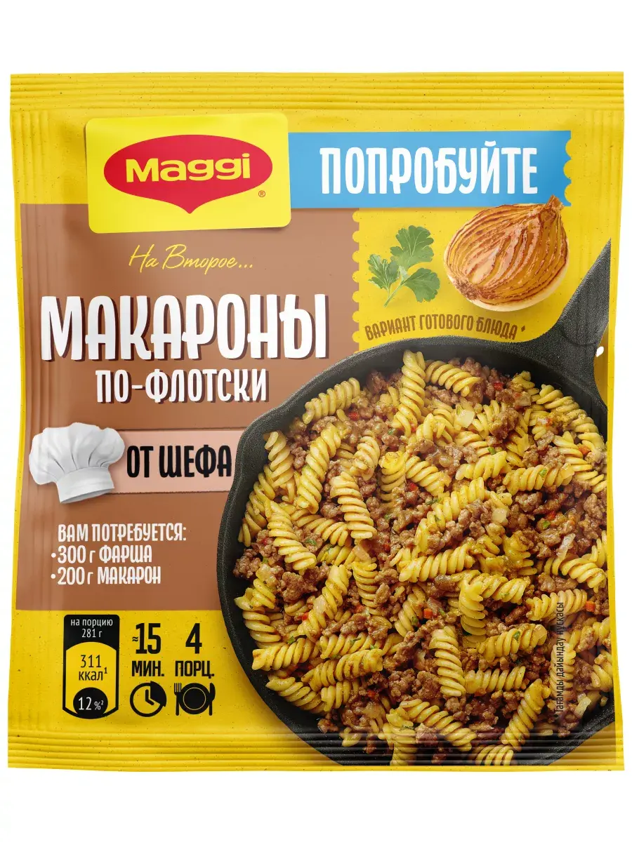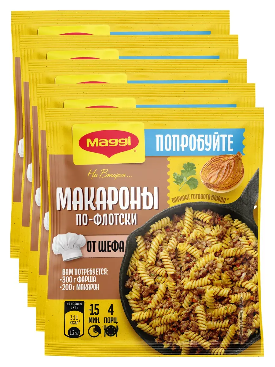 Попробуйте макароны по-флотски в оригинальном исполнении! Благодаря особому рецепту, который создал шеф-повар МАГГИ, макароны готовятся с фаршем сразу в сковороде без дополнительного отваривания. Всего 15 минут, 3 ингредиента и 3 простых шага и аппетитное блюдо готово! Быстро за 15 минут. Не нужно отваривать макароны отдельно. Оригинальный рецепт от шефа. Всего 3 ингредиента. В состав входят 100% натуральные ингредиенты: сушёные овощи (лук репчатый, чеснок, морковь и лук-шнитт), а также специи (паприка, черный перец и куркума). В комплекте 5 пакетиков по 26г.