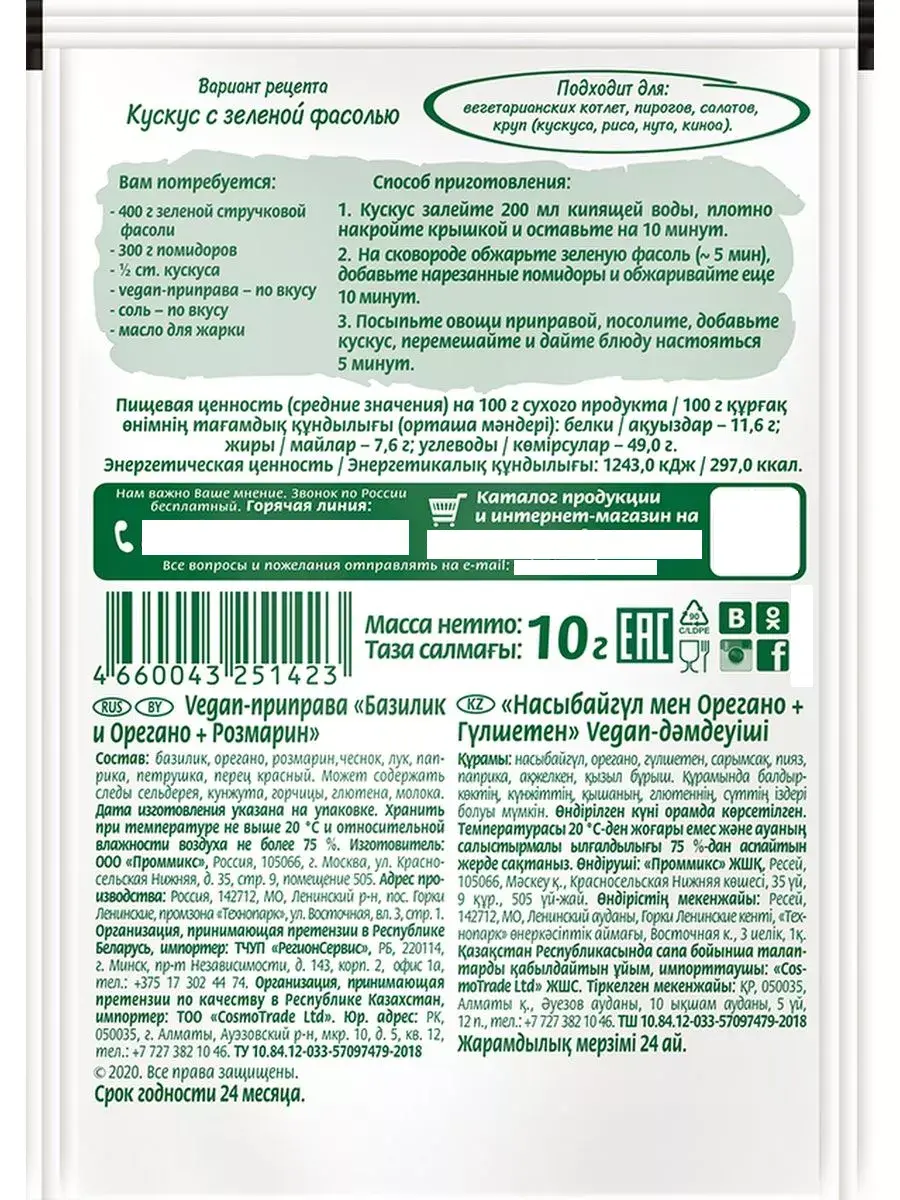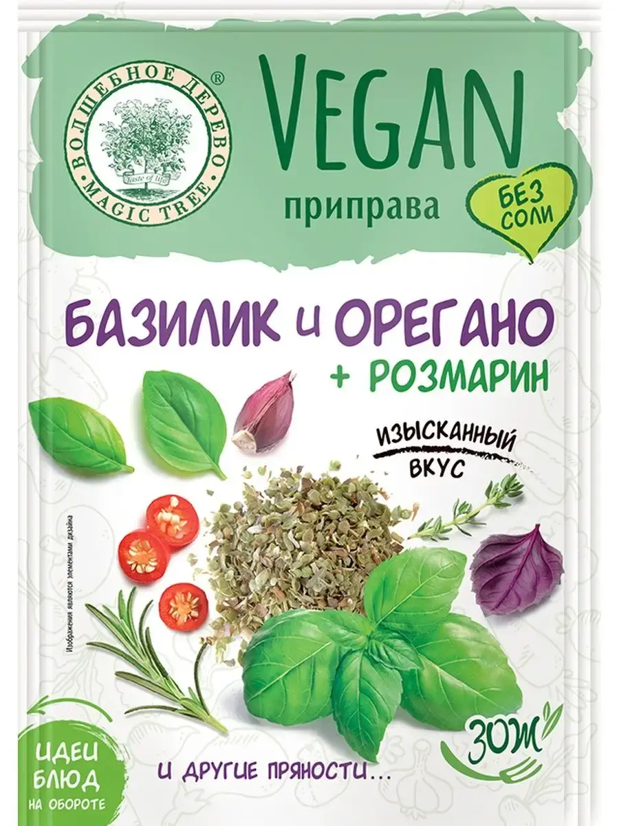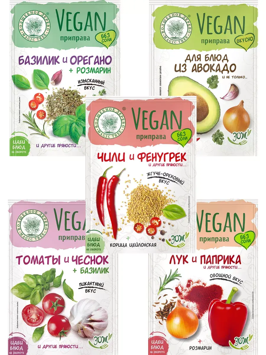 Серия «Vegan» специально разработана для веганов и тех, кто ведет здоровый образ жизни. Хотите изысканный вкус вашего блюда? Не бойтесь импровизировать на вашей кухне. Попробуйте приготовить вегетарианские блюда вкусными и полезными. Веганские блюда будут еще вкуснее и полезнее с приправами "Волшебное дерево". Приправа поможет не только улучшить вкус ваших блюд, но и качество вашей жизни. Подходит для веганских и вегетарианских котлет, пирогов, салатов, различных блюд из круп (кускуса, риса, нута, киноа). В комплекте 5 пакетиков ассорти.