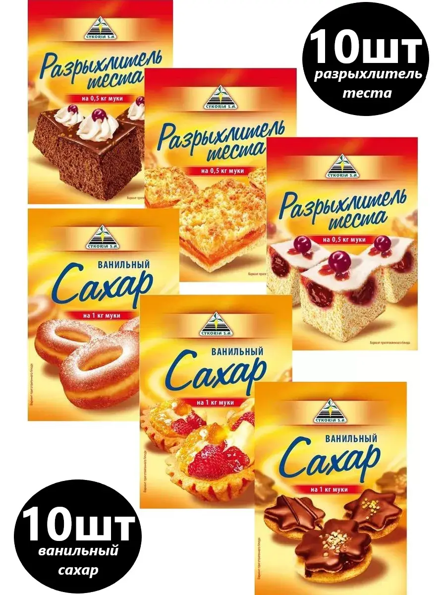 В наборе представлено 10 пакетиков разрыхлителя теста и 10 ванильного сахара в разных дизайнах. Всего в наборе 20 пакетиков.
