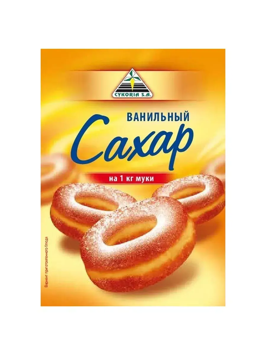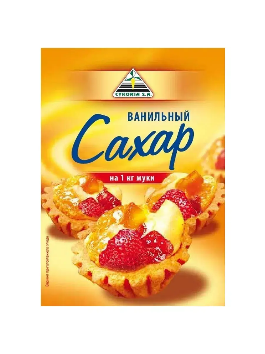 Ванильный сахар "Cykoria S.A." – это высококачественный продукт, сделанный на основе ароматизированного сахара. Ванильный сахар предназначен для изготовления сладкой выпечки и множества других десертов. А также используется для ароматизации кремов, муссов, молочных десертов, мороженого.