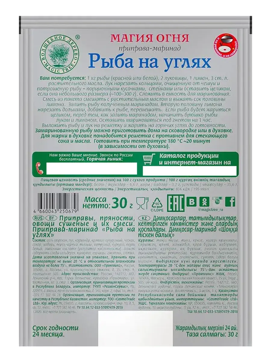 Один из главных секретов приготовления ароматного и сочного рыбного шашлыка - правильный маринад. Благодаря специально подобранным специям мясо получается сочным, ароматным и тающим во рту! Один пакетик приправы рассчитан на приготовление маринада для 1 кг красной или белой рыбы. Дополнительно вам потребуется лишь пара луковиц, лимон и 3 столовые ложки растительного масла. После часа, проведенного в таком маринаде, будущее блюдо можно отправлять на угли или приготовить дома на сковороде или в духовке. Запеченная таким образом рыба получится сочной, ароматной и потрясающе вкусной!