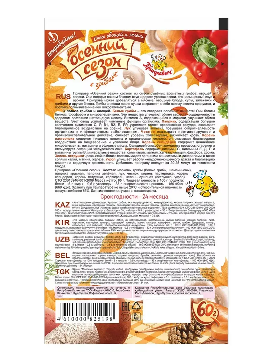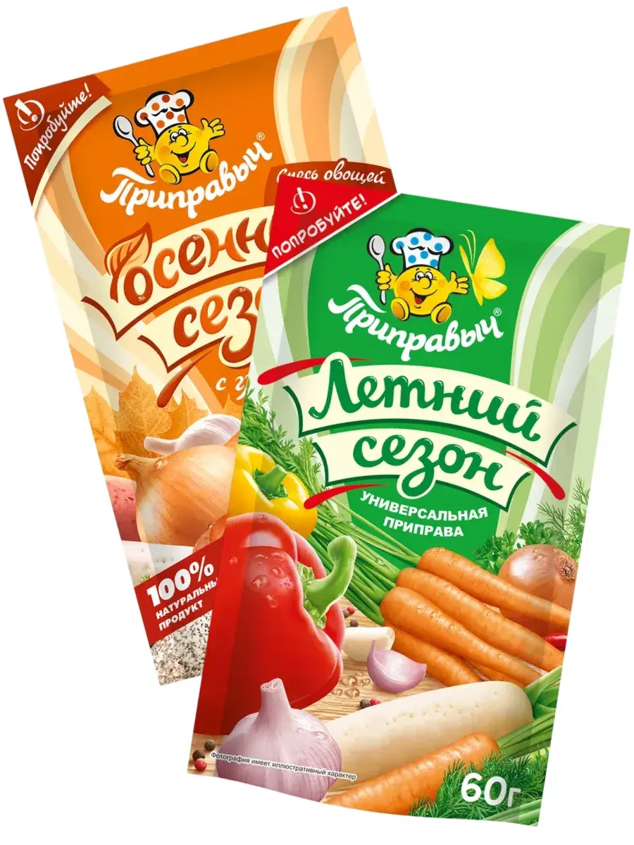 Лето радует нас щедрым урожаем согретых на солнце овощей и зелени. В приправе «Летний сезон» собран яркий букет овощей и зелени, дарящий частицу летнего настроения. Эта приправа универсальна и может применяться в любых блюдах по вашему желанию: в супах, в мясных и рыбных блюдах, различных гарнирах и многих других. Приправа «Осенний сезон» состоит из смеси сушёных ароматных грибов, овощей и зелени. Она подарит Вашим блюдам вкус щедрого урожая осени, его насыщенный вкус и аромат! Приправа может добавляться в мясные, овощные блюда, супы, запеканки с грибами и другие блюда. В наборе 2 штуки по 60г ассорти.