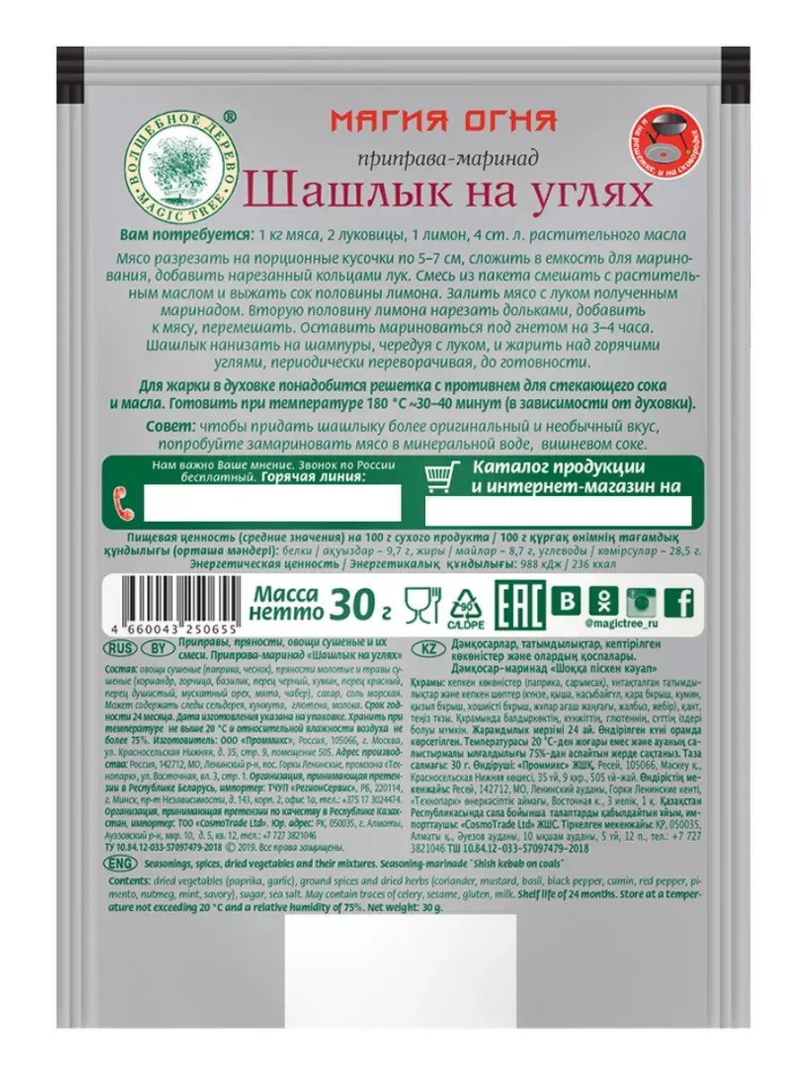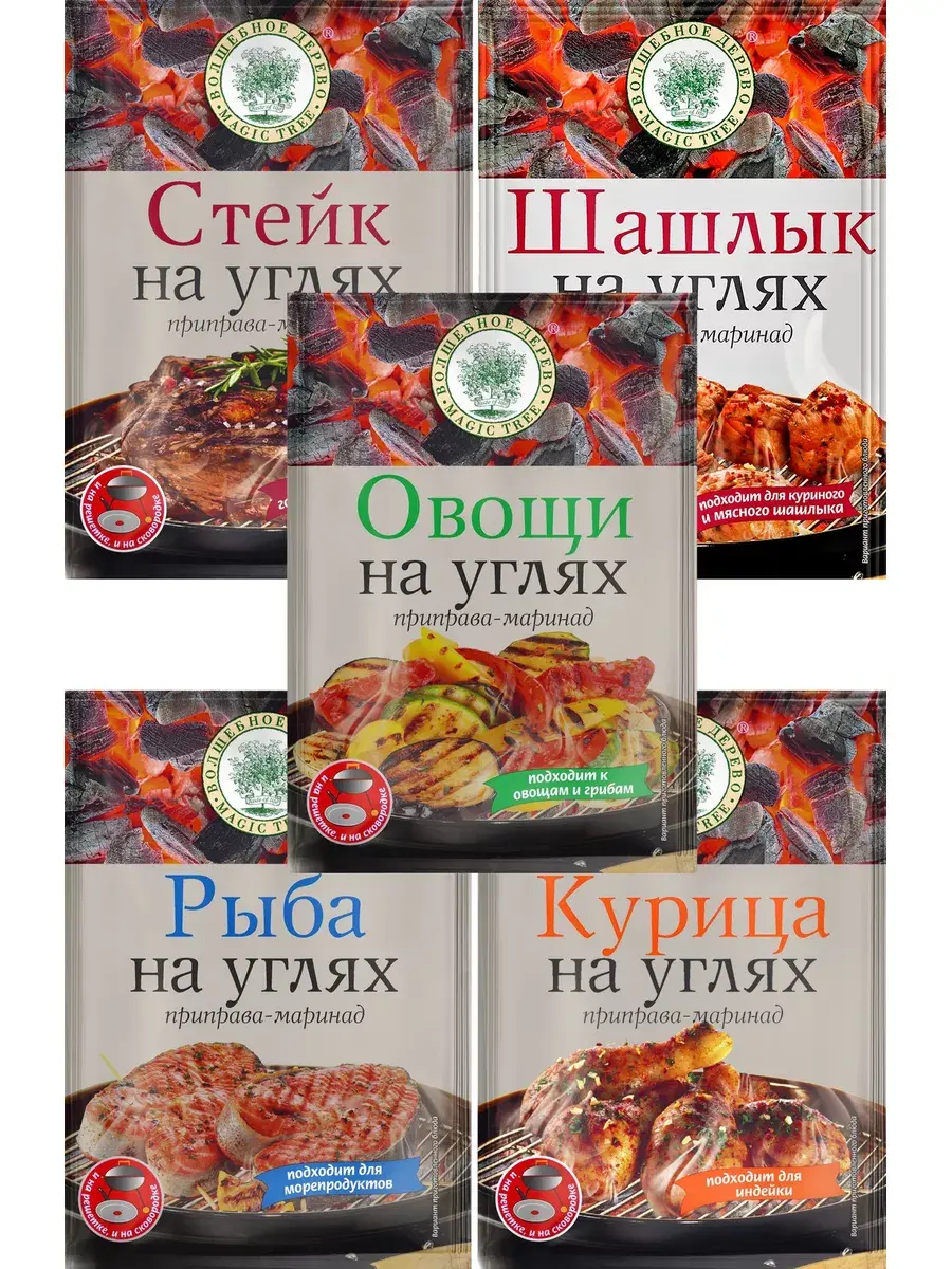 Набор приправ-маринадов для стейка, шашлыка, рыбы, курицы и овощей на углях - это незаменимый набор для пикника. Свежее качественное мясо достойно уважительного отношения – правильной сковороды, точности времени и температуры приготовления и, конечно, лучших ароматных приправ! Не важно, готовите ли вы дома в духовке или на открытом огне, мясо все равно получится сочным и очень вкусным. Сегодня в качестве шашлыка можно приготовить не только мясо или курицу, но и самые разнообразные овощи. Чтобы вы ни выбрали – кабачки, картофель, баклажаны или томаты, ко всему подойдет наша универсальная приправа. В ней собраны лучшие специи со всего мира: мускатный орех, паприка, орегано… С ними полезные овощи превращаются в изысканный деликатес, здоровое питание становится полноценным и вкусным! В комплекте ассорти 5 штук по 30г.