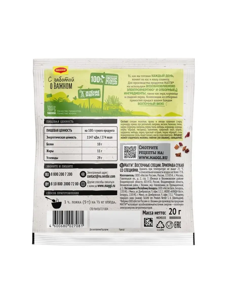 В приправе «Восточные специи» подобрана композиция из отборных пряностей, таких как зира, кориандр и сладкий перец, которая придаст вашим блюдам ВОСТОЧНЫЙ ВКУС!
