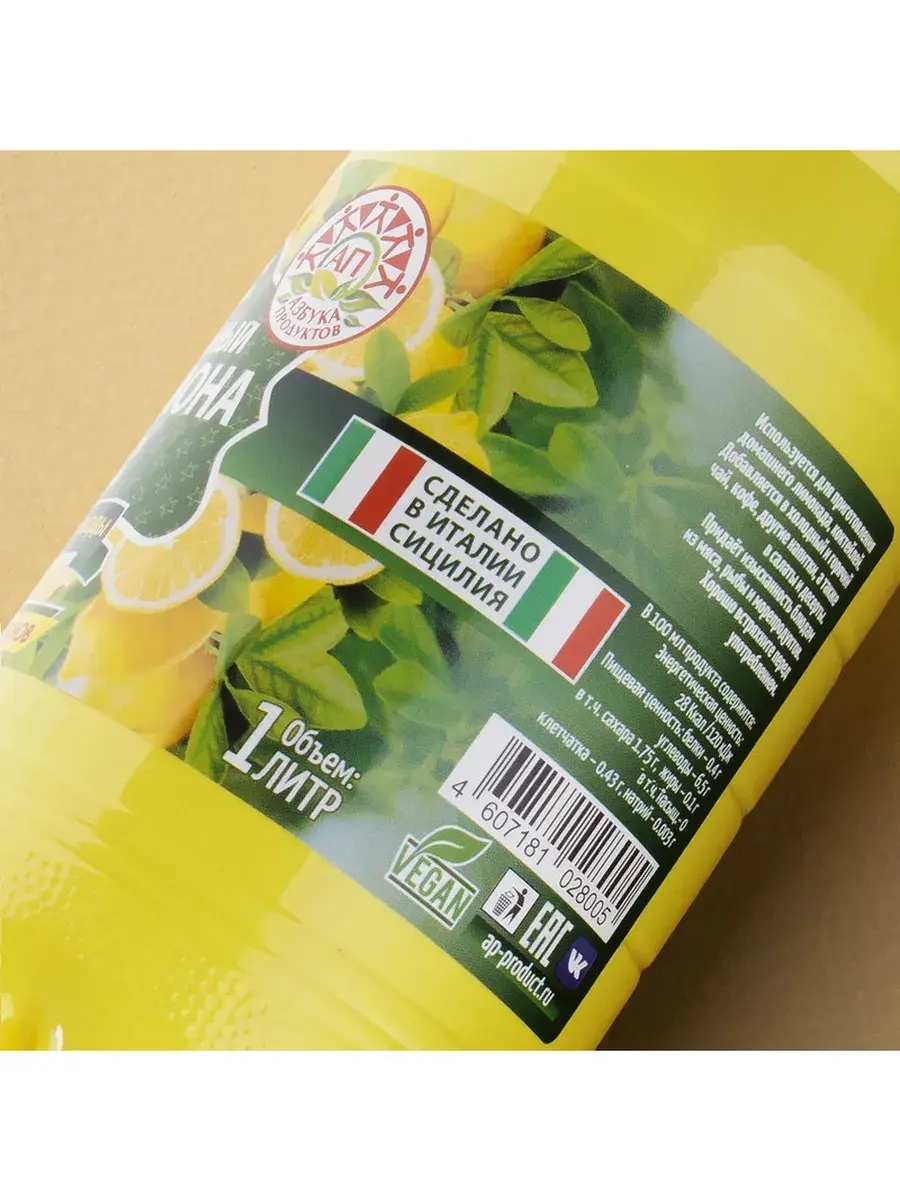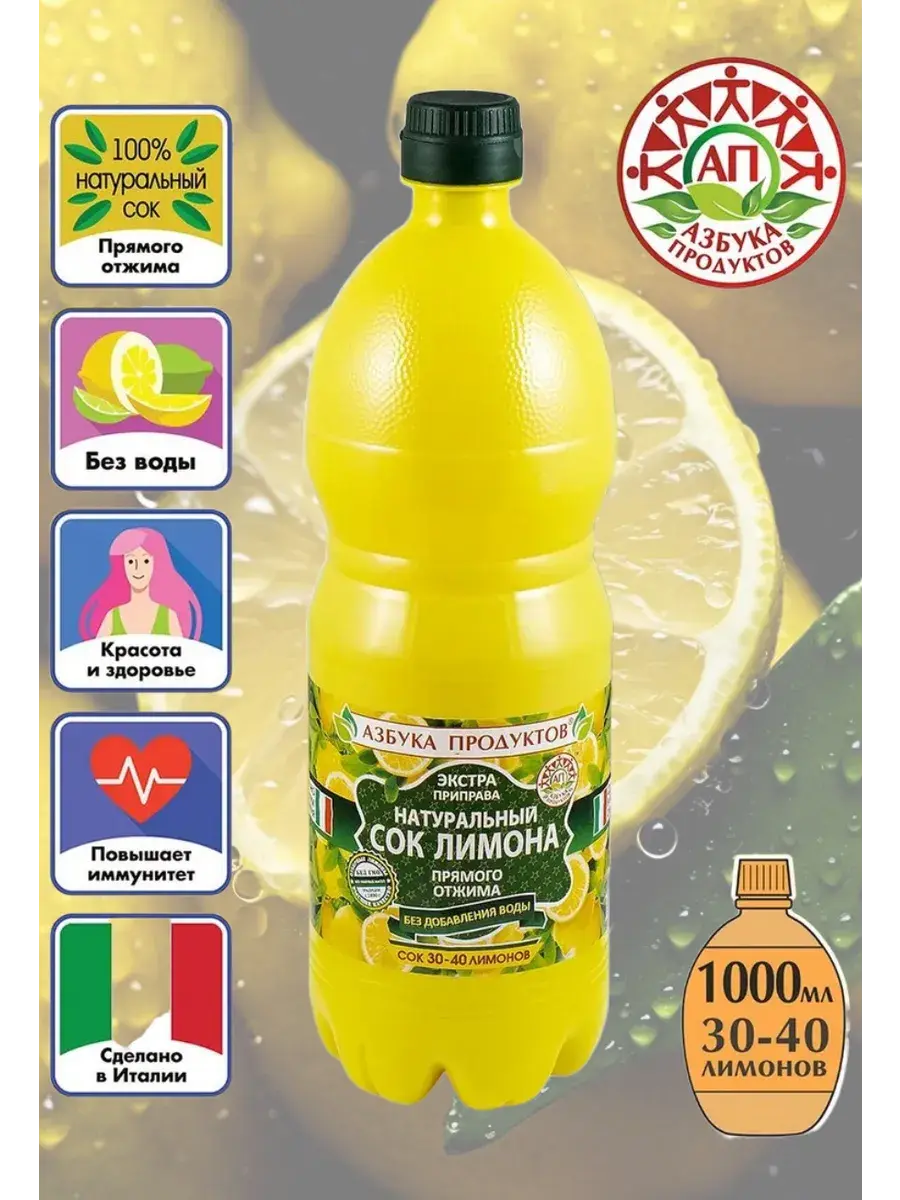 Натуральный сок лимона производится методом прямого отжима на Сицилии — солнечном острове, который известен как крупнейший поставщик цитрусовых в мире. Не содержит сахара, воды, ГМО, красителей и ароматизаторов. Может использоваться для приготовления салатов, маринадов, горячих блюд, соусов, десертов, лимонадов, алкогольных и безалкогольных коктейлей. Добавляется в холодный и горячий чай, кофе. Придает изысканность блюдам из мяса, рыбы и морепродуктов. Сок лимона является важным компонентом веганских диет и правильного питания. Он служит ценным источником витамина С, прекрасно тонизирует, способствует увеличению работоспособности, выводит из организма шлаки и токсины, оказывает противомикробное и антисептическое действие. На изготовление 1000мл сока ушло примерно 30-40 лимонов. Хорошо встряхните перед употреблением.
