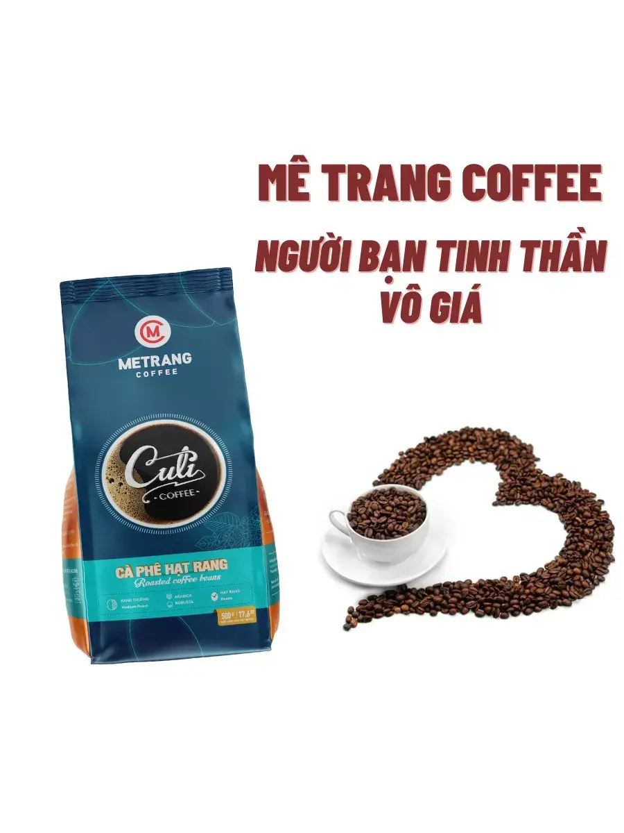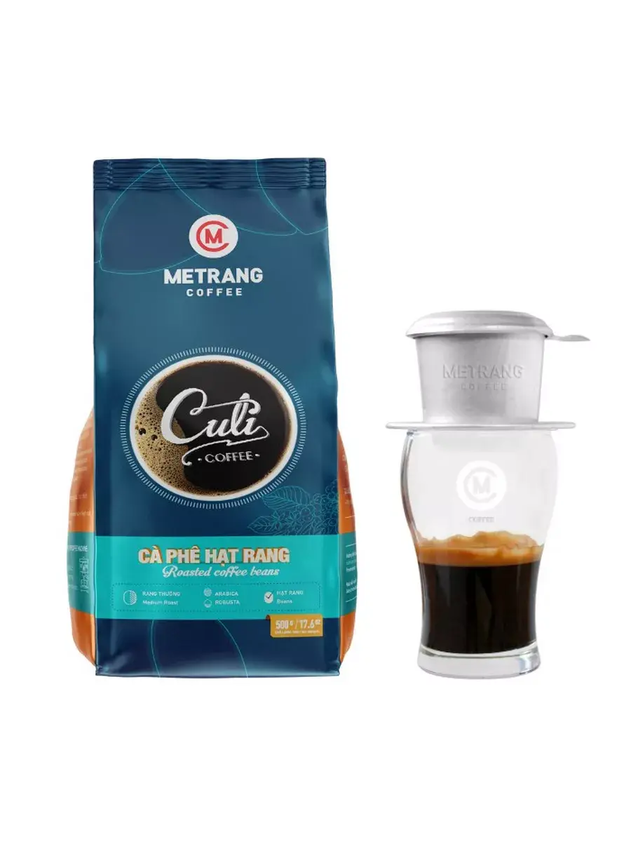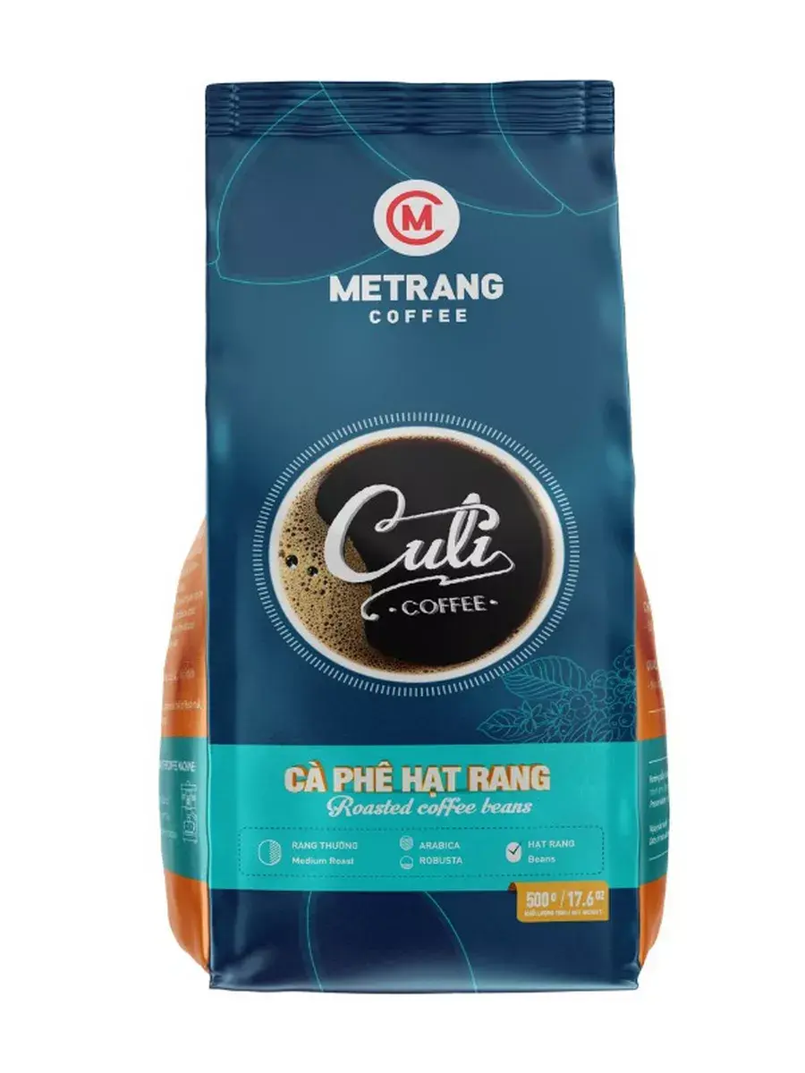 Кофе Me Trang в зернах Culi – утонченная смесь, состоящая из 70% арабика 30% робуста, произрастающие на плодородных плантациях Вьетнама. Средняя обжарка зерен сообщает смеси нежный вкус без кислинки с едва уловимыми нотками молока и мягкой горчинки, густого аромата и бархатистой консистенции. Содержание кофеина в смеси составляет 1%. Вьетнамский кофе в зернах Кули поставляется в фольгизированном пакете с клапаном объемом 500 г, обеспечивающем сохранность вкусовых качеств смеси.