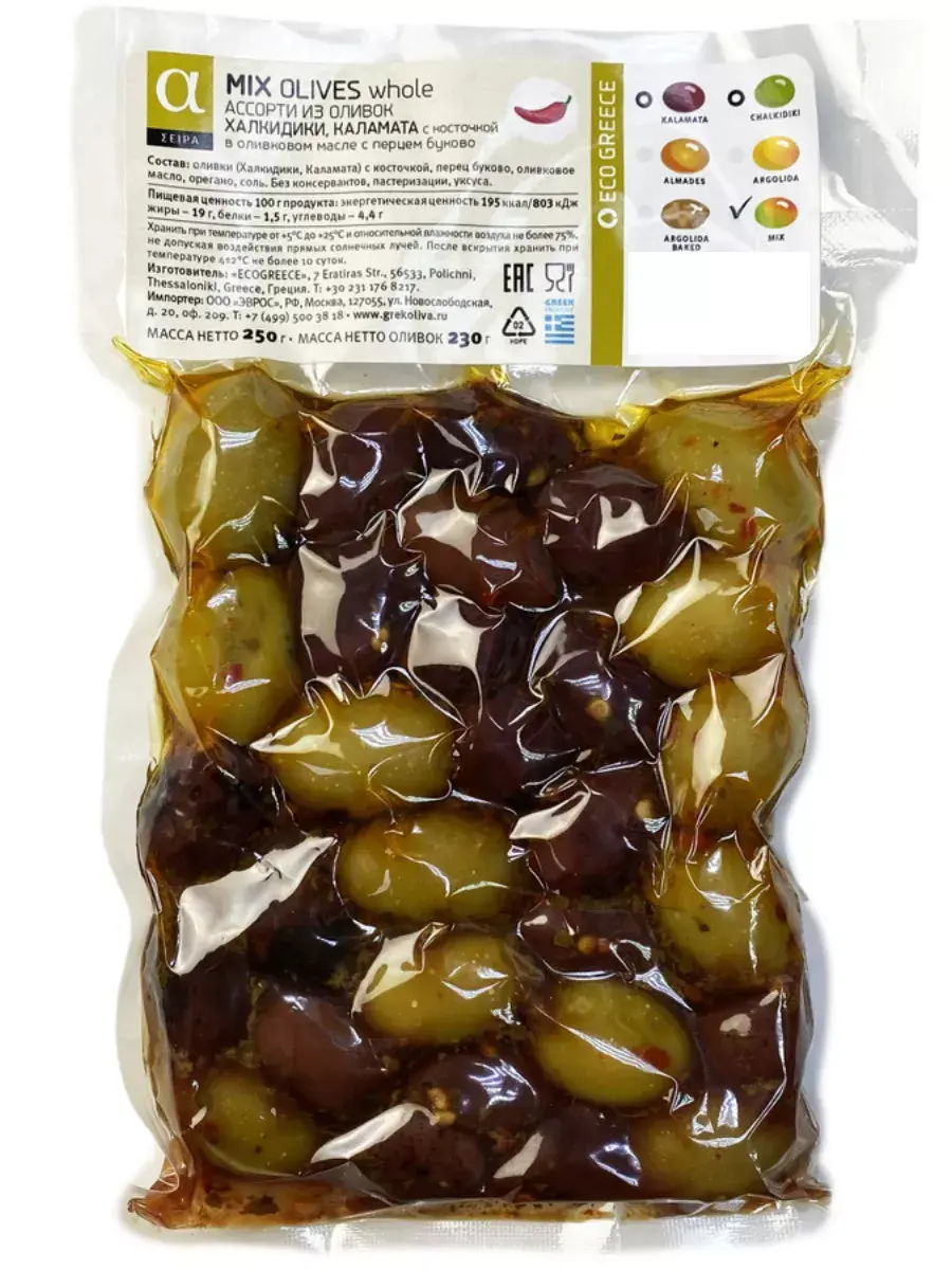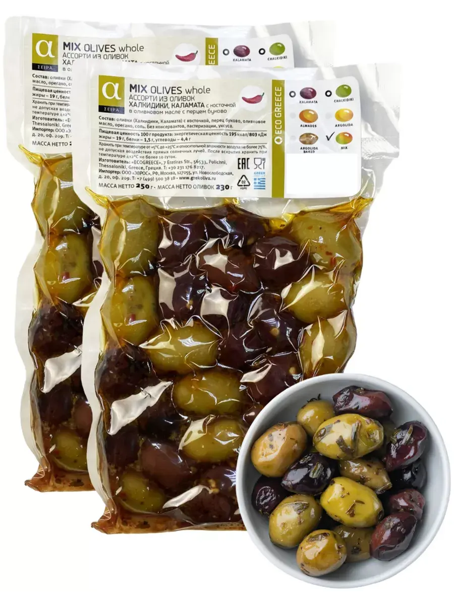 Ассорти микс сочетает в себе сочные и мясистые оливки с косточкой сорта Халкидики и Каламата, известные своим насыщенным ароматом и нежной текстурой. Сорт Халкидики: Зеленые оливки с плотной, мясистой текстурой и нежным вкусом. Сорт Каламата: Фиолетово-черные оливки с насыщенным ароматом и слегка сладковатым послевкусием. Перец буково - традиционная греческая приправа, добавляющая легкую остроту и пикантность, делая вкус ассорти еще более насыщенным. Идеально подходит для легких закусок, приготовления салатов, украшения блюд и создания вкусных кулинарных шедевров. Без консервантов, пастеризации и уксуса. В комплекте 2 пачки по 250г.