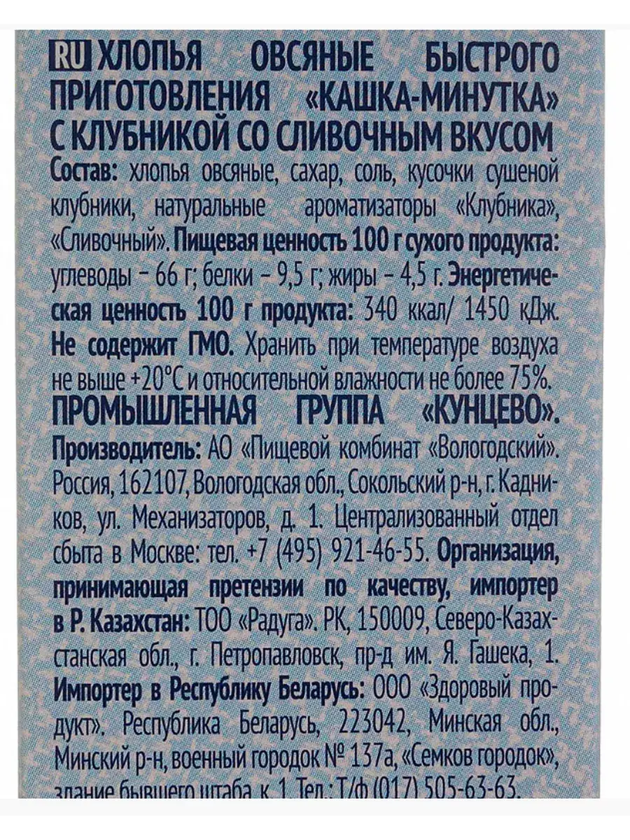 Овсяные хлопья со сливочным вкусом "Кашка Минутка" от "Кунцево" понравятся всем, кто любит полезные овсяные каши быстрого приготовления. "Кашка Минутка" представлена в разных вариантах на любой вкус, сделана с добавлением натуральных сушеных ягод. Она не очень сладкая, сытная, густая, с приятным фруктовым и ягодным ароматом и сливочным послевкусием. Сладкоежки могут добавить к ней дополнительный сахар. Такие хлопья будут хороши как на воде, так и на молоке. Можно просто запаривать кипятком или готовить в микроволновке. Попробуйте! Это отличный вариант для быстрого завтрака и полезного перекуса в офисе.